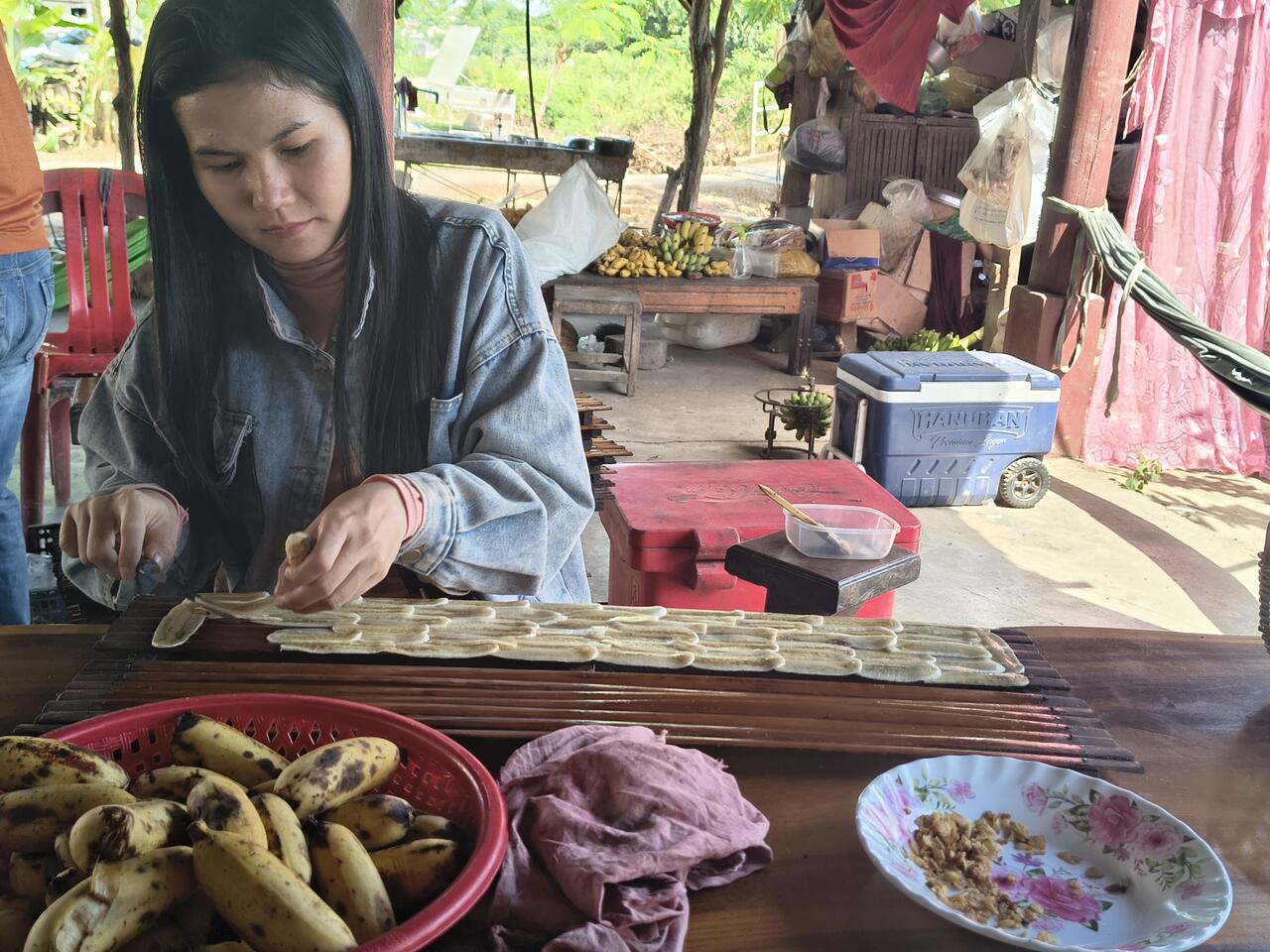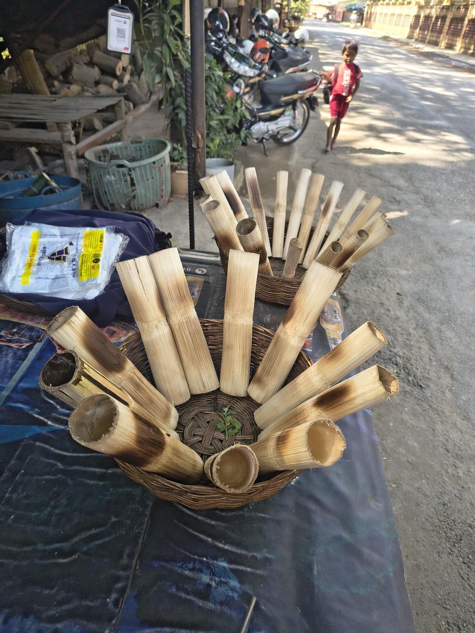 Für Sticky Rice werden Bambusstücke abgesägt, mit einer Mischung aus Reis, Kokosmilch, Zucker und schwarzen Bohnen gefüllt, mit Stopfen aus Bananenblättern versehen und über offenem Feuer gegart