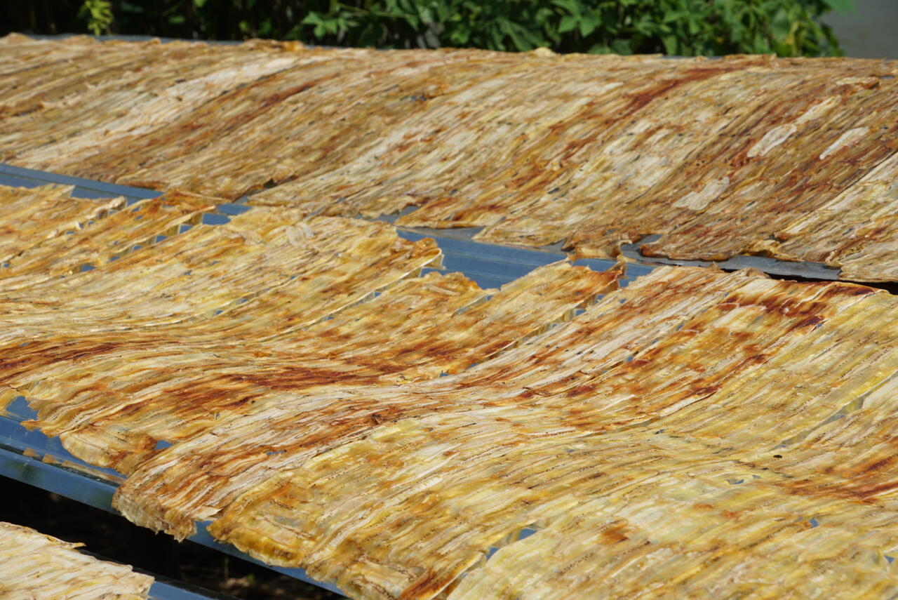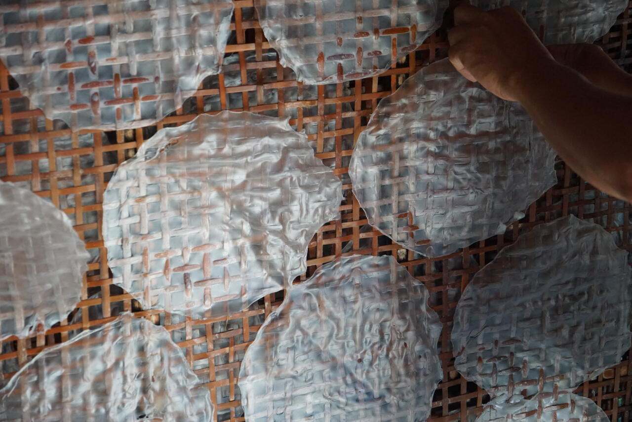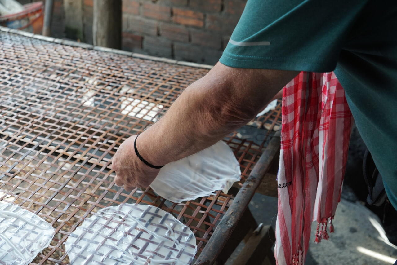 Das frisch gebackene Reispapier ist noch nass und sehr empfindlich, es wird erst über die blauen Röhren gehängt und mit diesen dann auf Drahtgeflecht abgerollt. Die ältere Dame sitzt den ganzen Tag vor ihren 2 Pfannen die mit Holz befeuert werden und backt das Papier aus einem sehr dünnen Teig aus Reismehl und Wasser