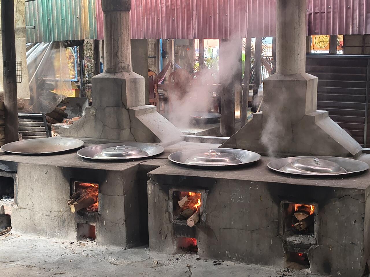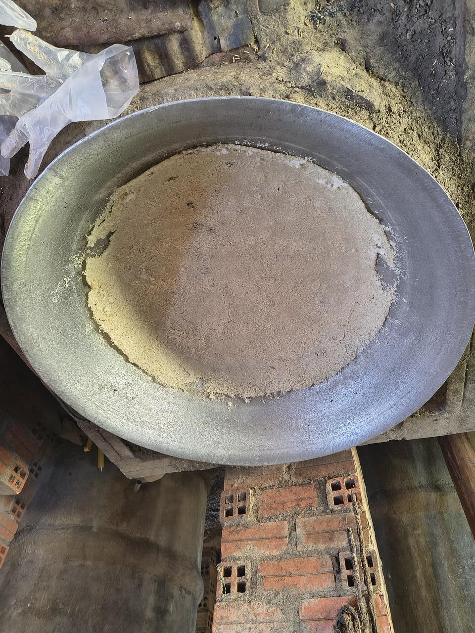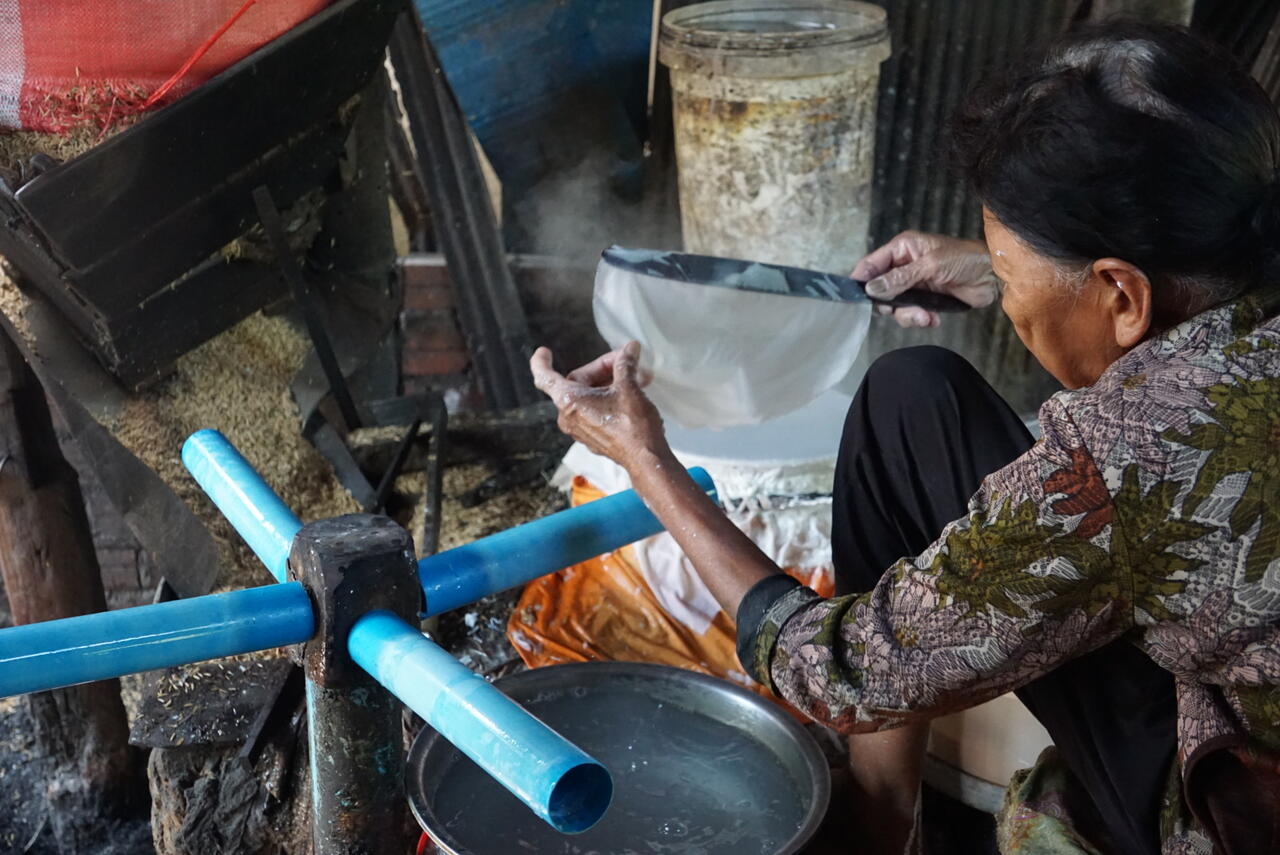 Das frisch gebackene Reispapier ist noch nass und sehr empfindlich, es wird erst über die blauen Röhren gehängt und mit diesen dann auf Drahtgeflecht abgerollt. Die ältere Dame sitzt den ganzen Tag vor ihren 2 Pfannen die mit Holz befeuert werden und backt das Papier aus einem sehr dünnen Teig aus Reismehl und Wasser