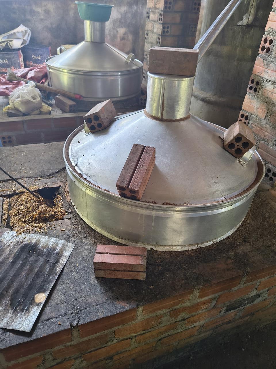 Der Reisschnaps tropft aus der Destille zuerst mit 70% und am Ende mit 30%. Der 70%ige wird mit Schlangen darin zu Medizin für müde Männer, und mit Bananen angesetzt unterstützt er die Fruchtbarkeit bei Frauen.
