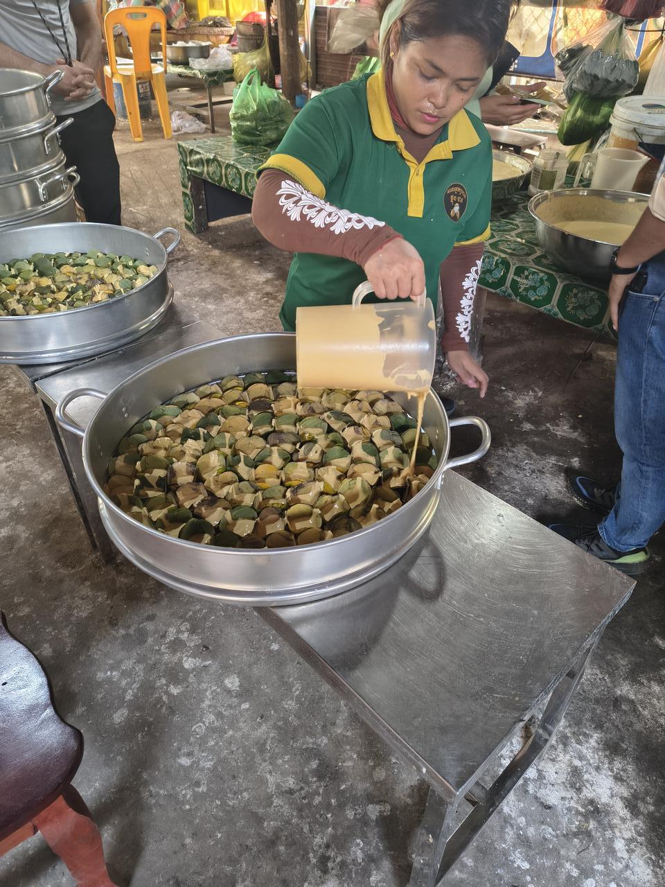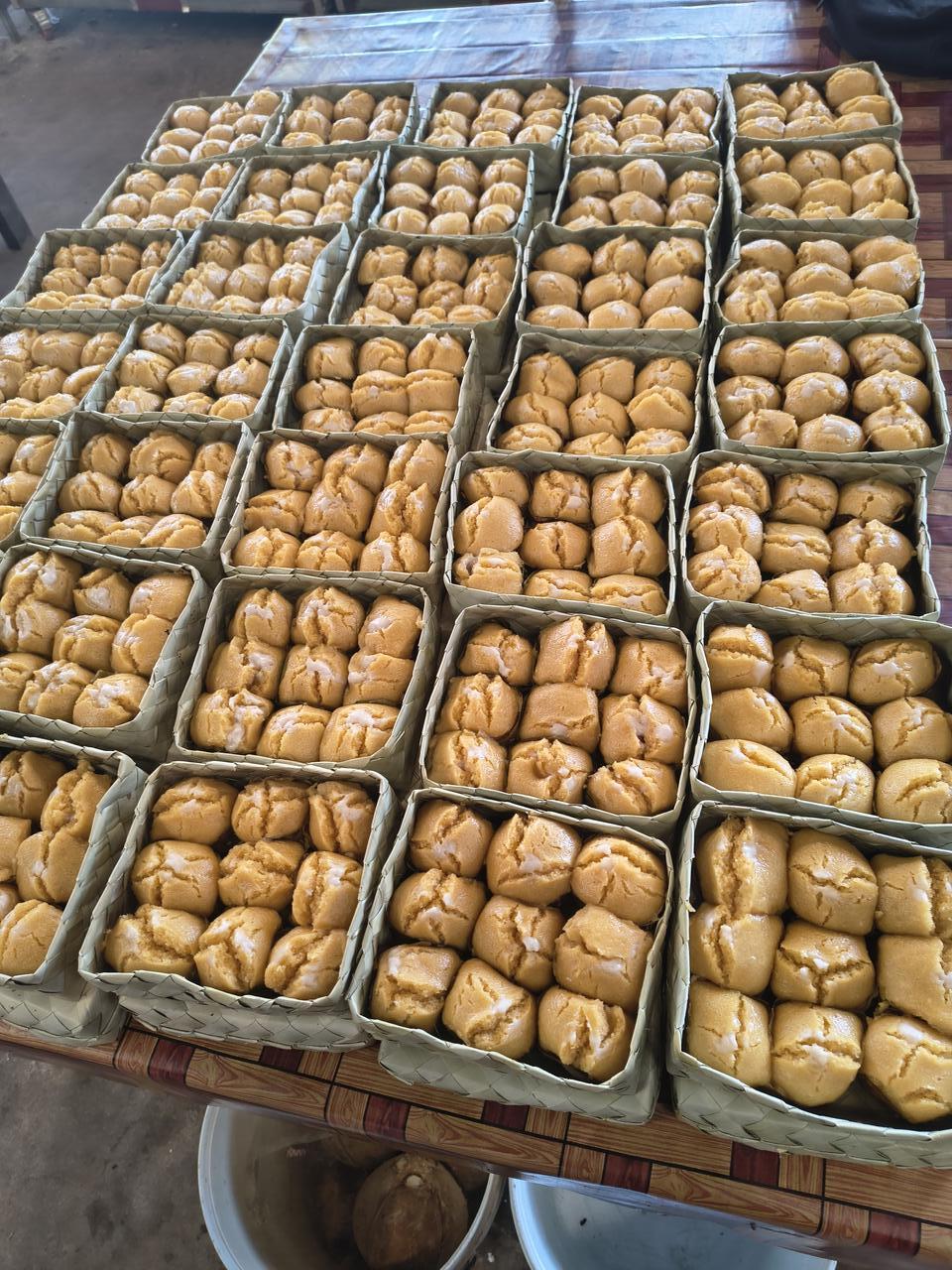 Palmmehlkuchen. Aus Palmmehl, Zucker und kokosmilch wird ein dünner Teig bereitet, in Förmchen aus Bananenblättern gefüllt und in der Mitte mit einem Klecks Kokoscreme versehen