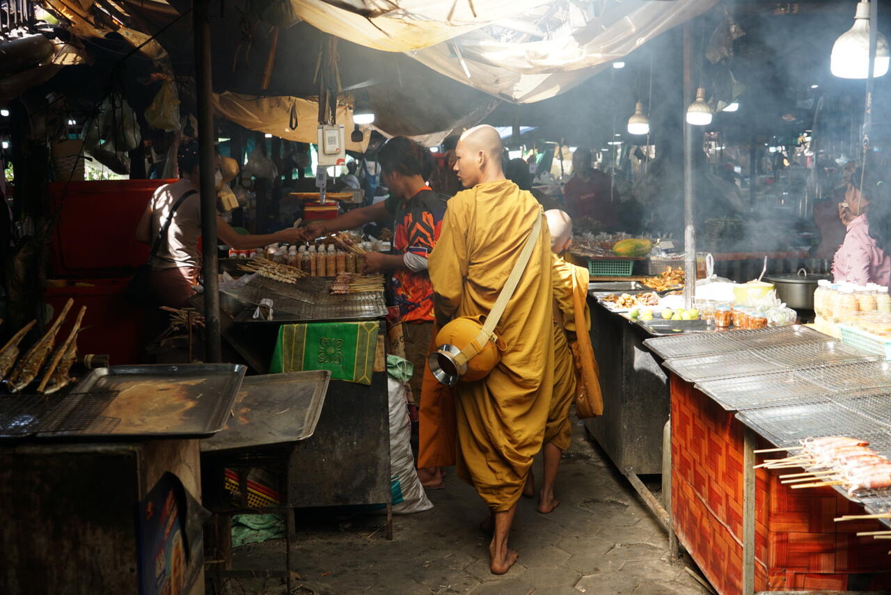 Mönche bei der täglichen Almosenbitte, gegessen darf nur werden was gespendet wurde und strengerweise auch nur bis 12:00, danach erst wieder am nächsten Tag. Immer häufiger sieht man Mönche mit gekauften Säften, Smartphones und Tablets aber diese werden von der Bevölkerung nicht akzeptiert denn Mönche sollten sich wie früher nur mit Spiritualität, Meditation und Demut beschäftigen und genießen dann auch höchsten Repekt. Das ist anders als bei vielen deutschen Katholiken die Veränderung wünschen aber die Kirche sich in weiten Teilen sträubt.