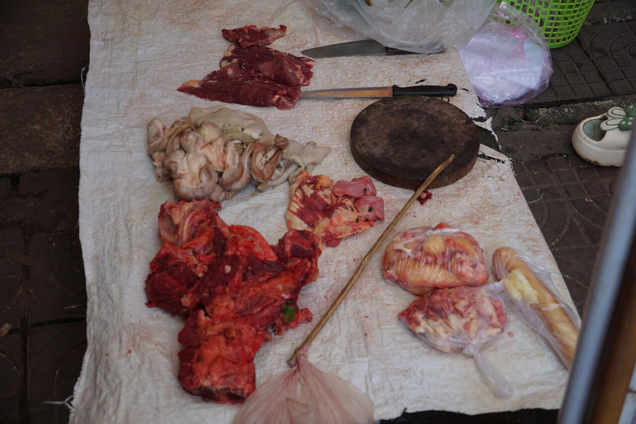 Auch undefinierbare Fleischstücke und Innereien werden verkauft, das sind dann immer unsere vegetarischen Momente