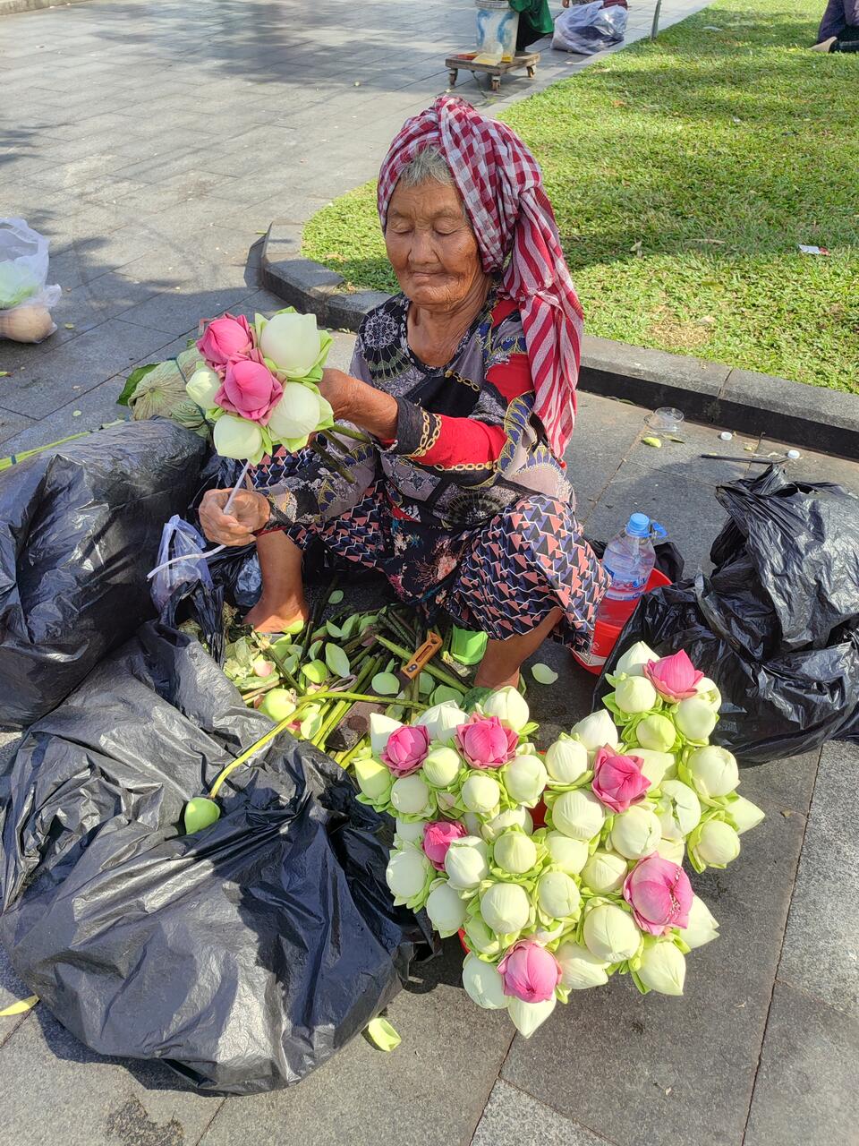 Der alten Dame haben wir Lotusblumen abgekauft und sie hat sich sehr gefreut dass wir sie mit einer Verbeugung zurückgegeben haben