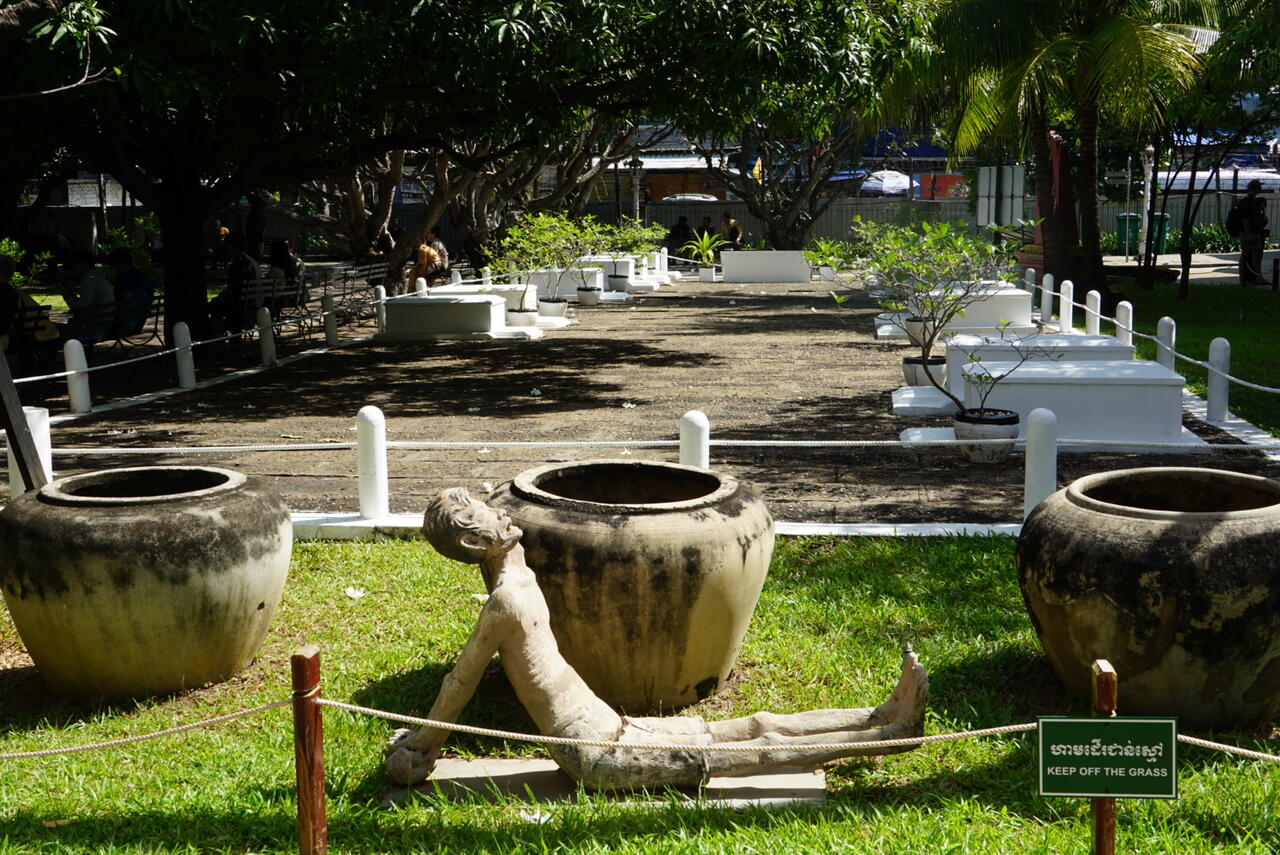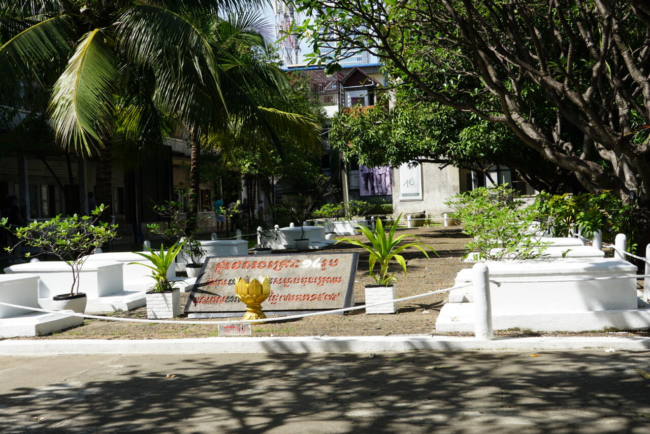 Die weißen Steinsärge symbolisieren die letzten 14 in S21 getötenen Menschen, die Frangipani gibt es in fast allen Tempeln und standen schon da als es eine Schule war.