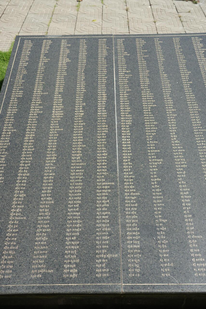 Viele Steinblöcke mit den Namen der Opfer, viele Menschen haben aber auch nie erfahren was mit ihren Angehörigen passiert ist denn viele Unterlagen wurden von den Roten Khmer kurz vor dem Sturz vernichtet