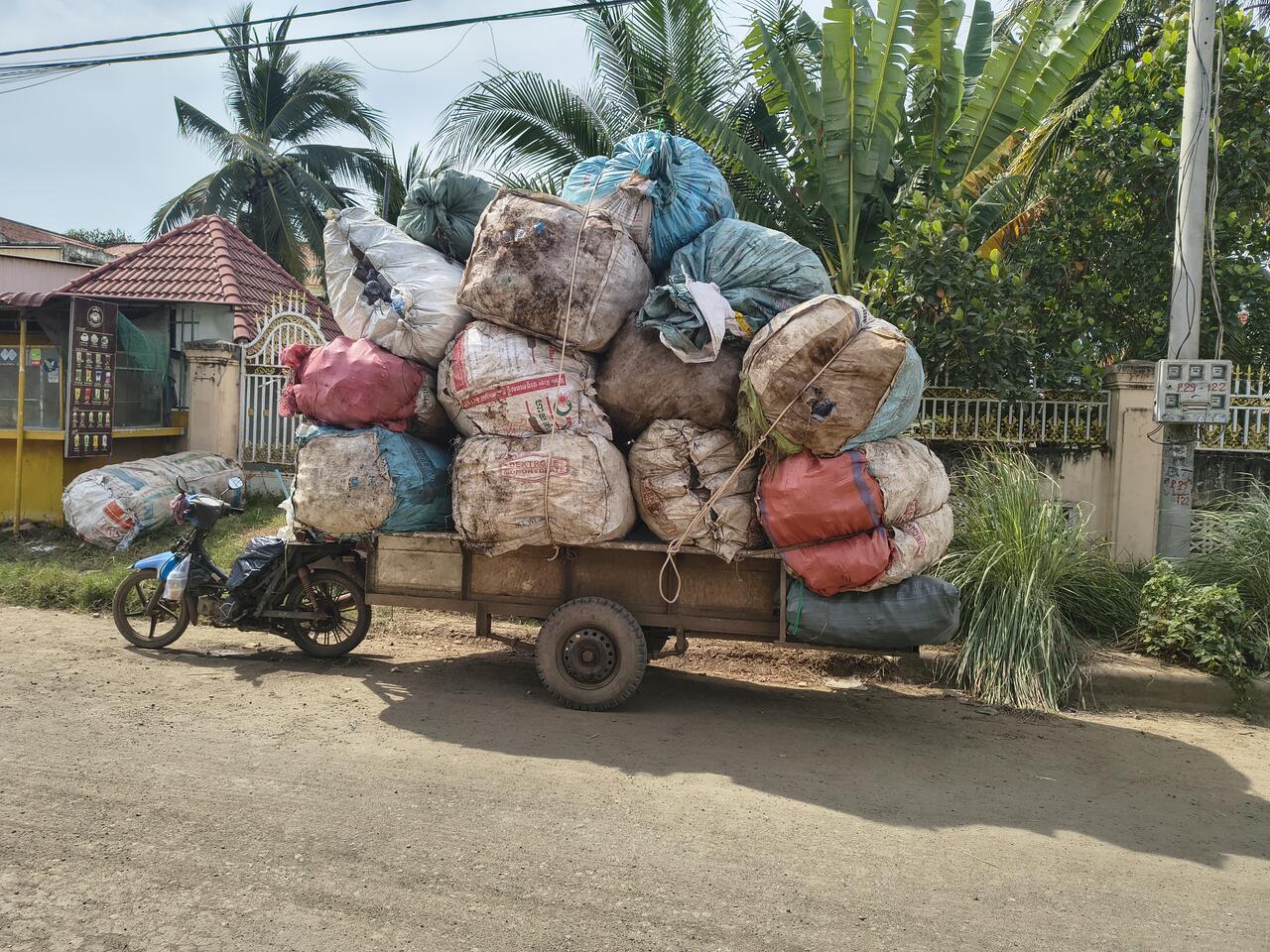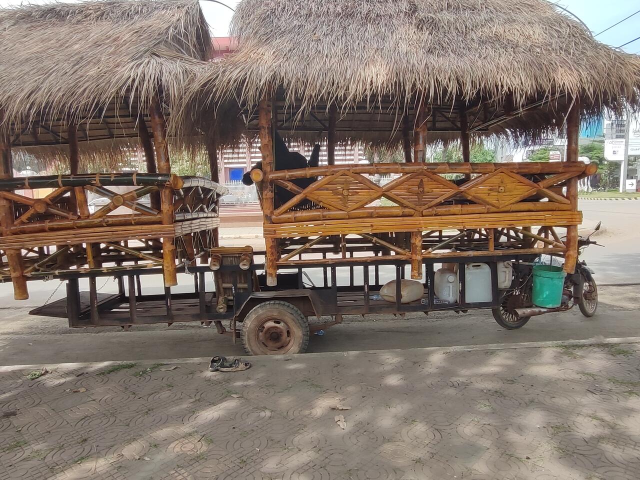 Partywagen. Wie das kleine Motorrad die beiden Wagen, zum feiern bestuhlt und mit Menschen vorwärtsbewegen kann ist uns ein Rätsel. Sie sind auch nur mit Stricken auf dem Metallgerüst befestigt, da hätte der TÜV seine Freude. Aber wie oft in Südostasien denken wir das funktioniert nie und es geht dann doch.