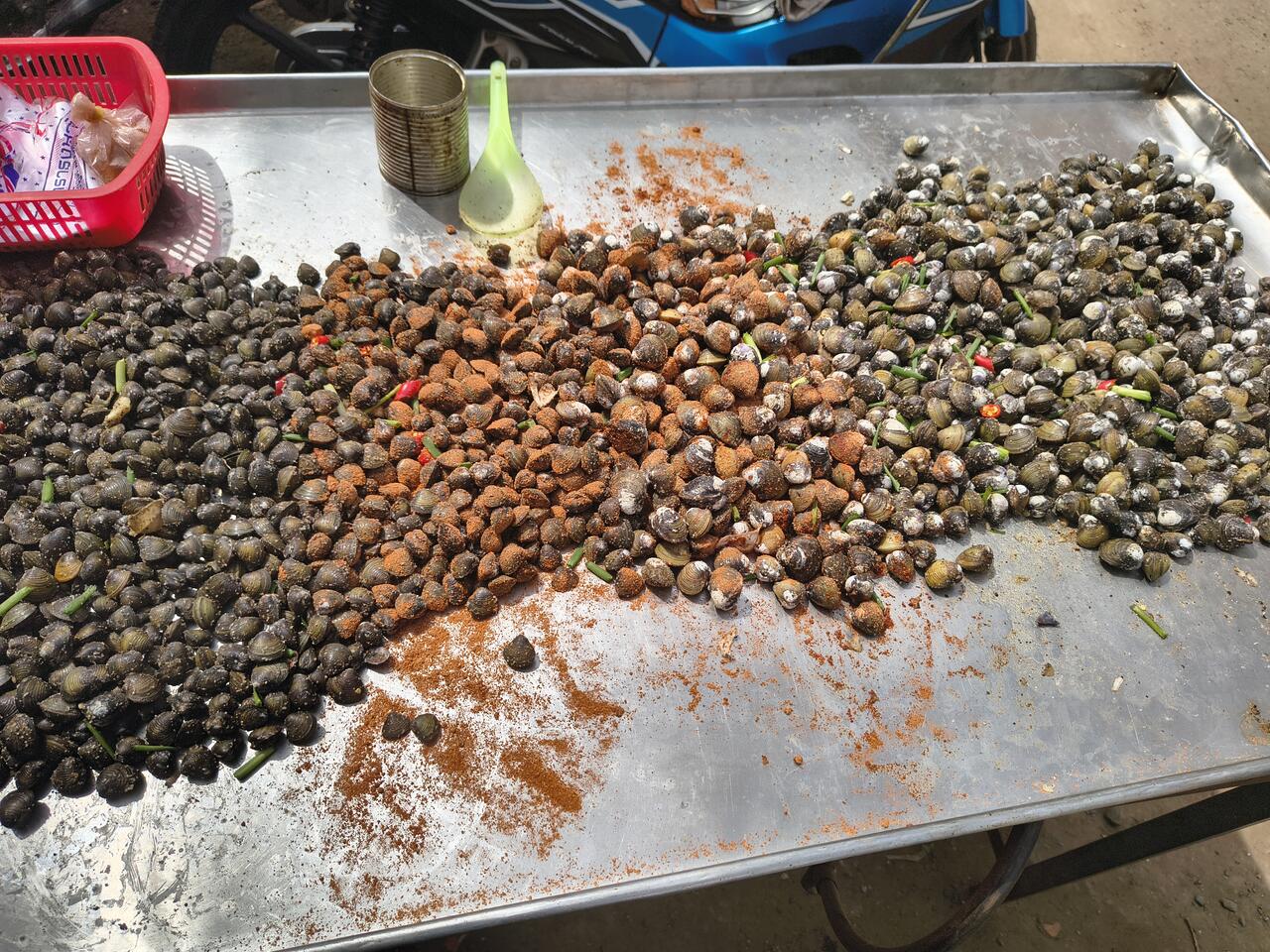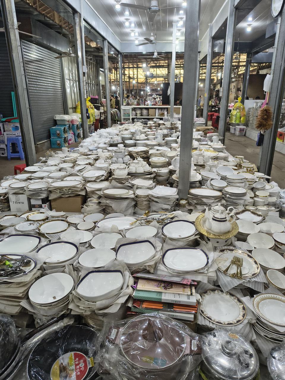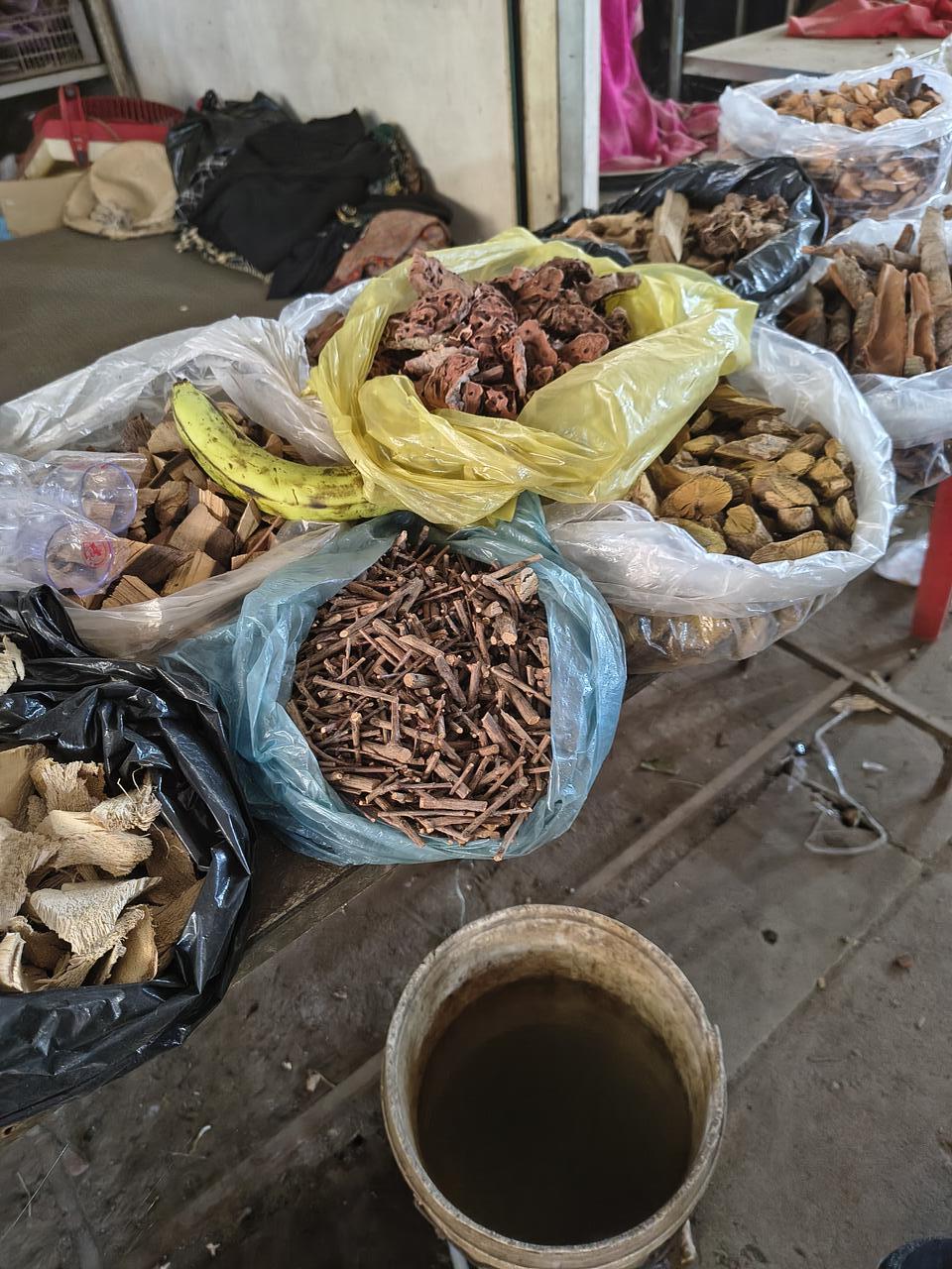 Auf dem großen Markt gibt es alles von Schmuck über Kleidung, Haushaltsgegenstände zu Gemüse, Fisch und Fleisch. Eine Dame hatte einen Stand mit Medizin, darunter getrocknete ganze Fledermäuse, als sie sah dass wir viele Fotos machen war sie sofort da um uns daran zu hindern ihre Medizin zu fotografieren. Am nächsten Tag als wir nochmal da waren war der Stand leer, wir sind uns nicht sicher ob es nicht verboten ist Fledermäuse zu verkaufen. Andere Medizinverkäufer hatten keine im "offiziellen" Angebot