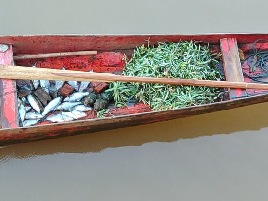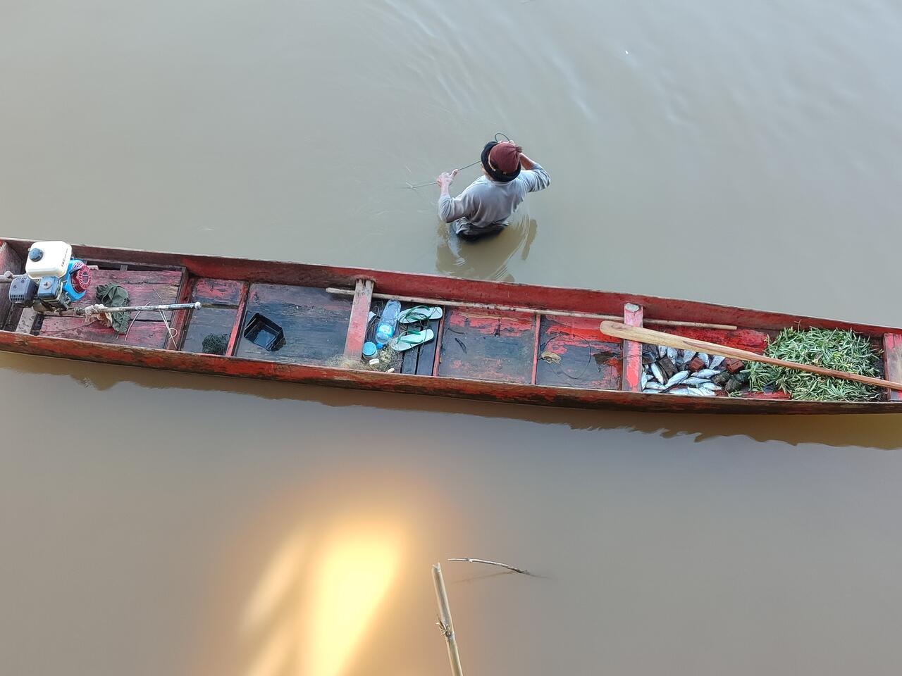 Der Fischer hatte einige Fische in der Reuse und von einer der Inseln hat er Bambusspitzen mitgebracht