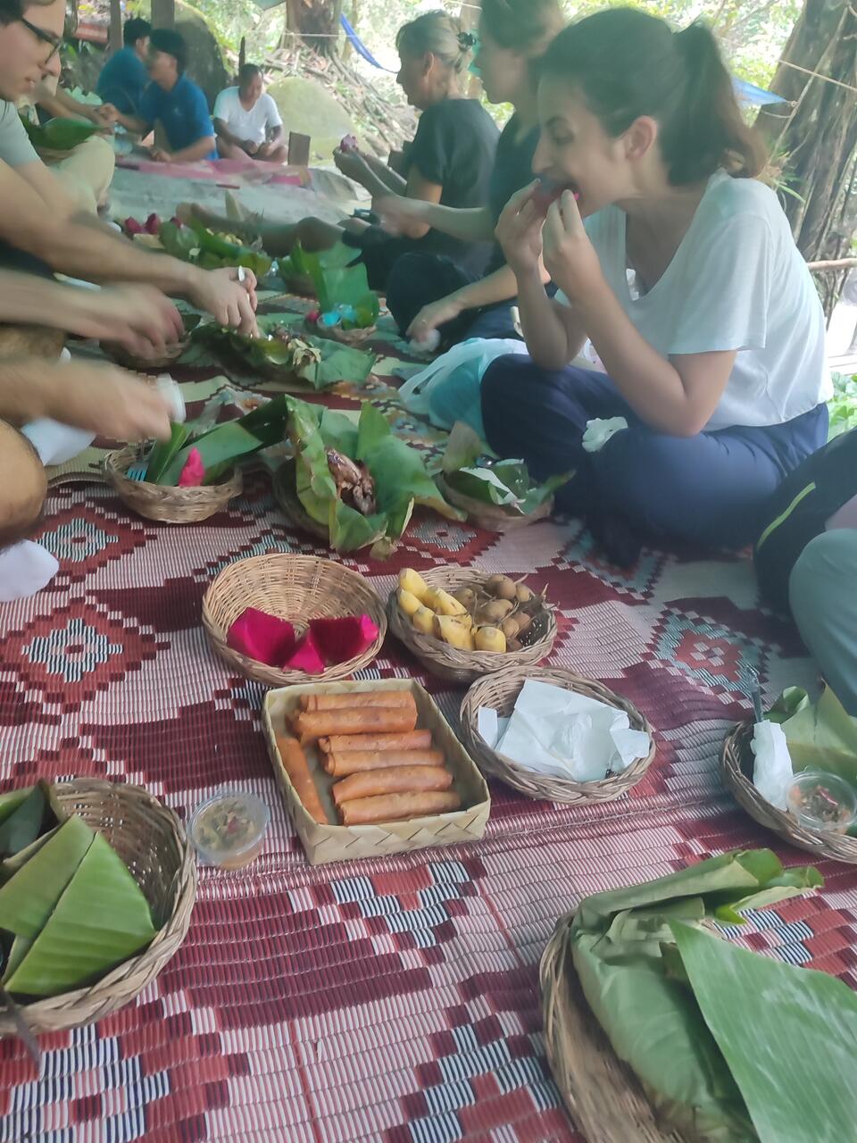 Mittagessen kambodschanisch am Boden mit Bananenblättern und Bastkörbchen am Boden sitzend aber es war lecker und eine bunte internationale Truppe mit Spanien, Rumännien, UK, USA, Mexiko und Frankreich
