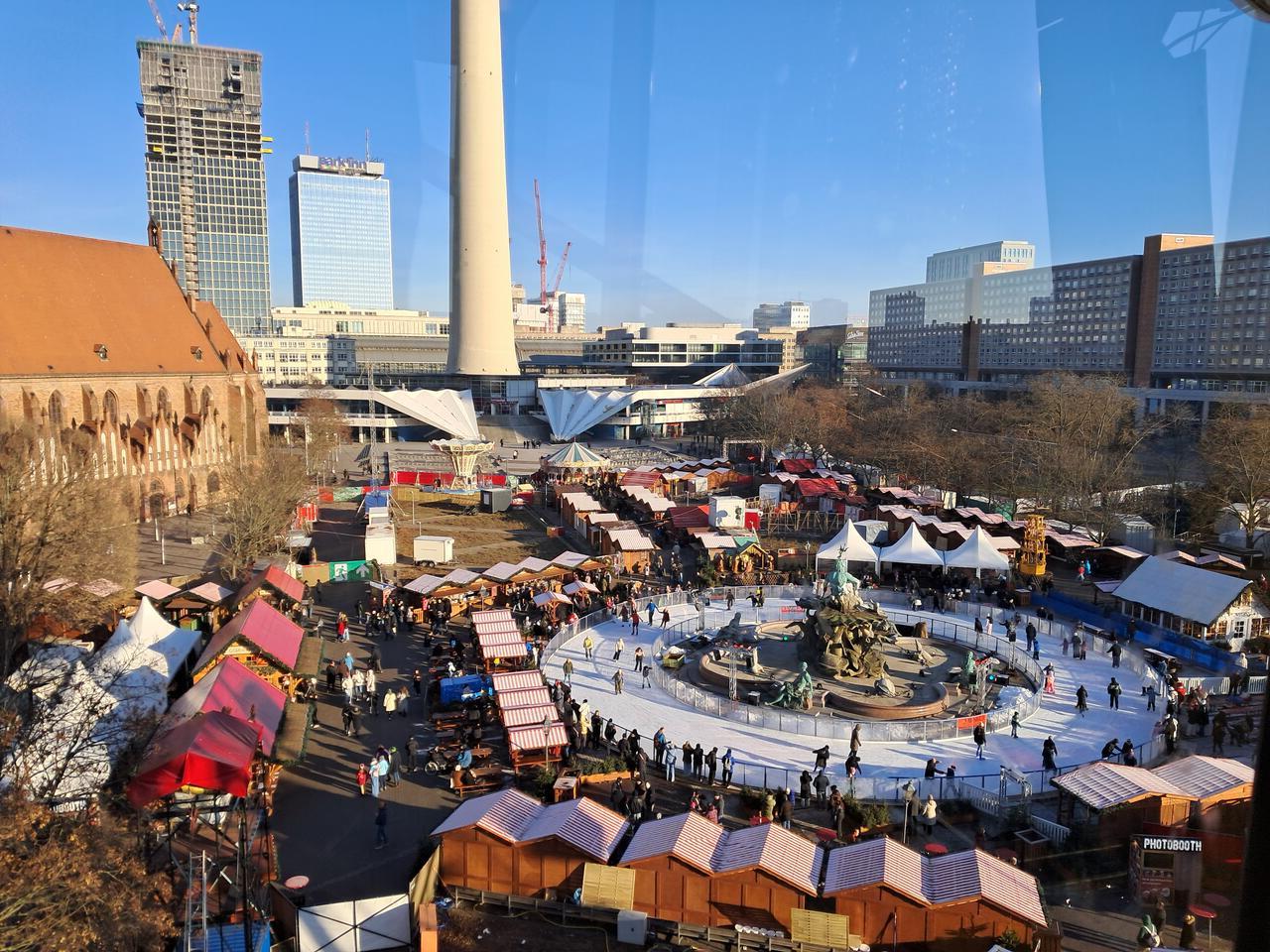 Einen phantastischen Ausblick auf die Museumsinsel, den Alexanderplatz und viele weitere Sehenswürdigkeiten hat man von der Dachterrasse, leider war diese wegen Eisglätte gesperrt für Besucher.