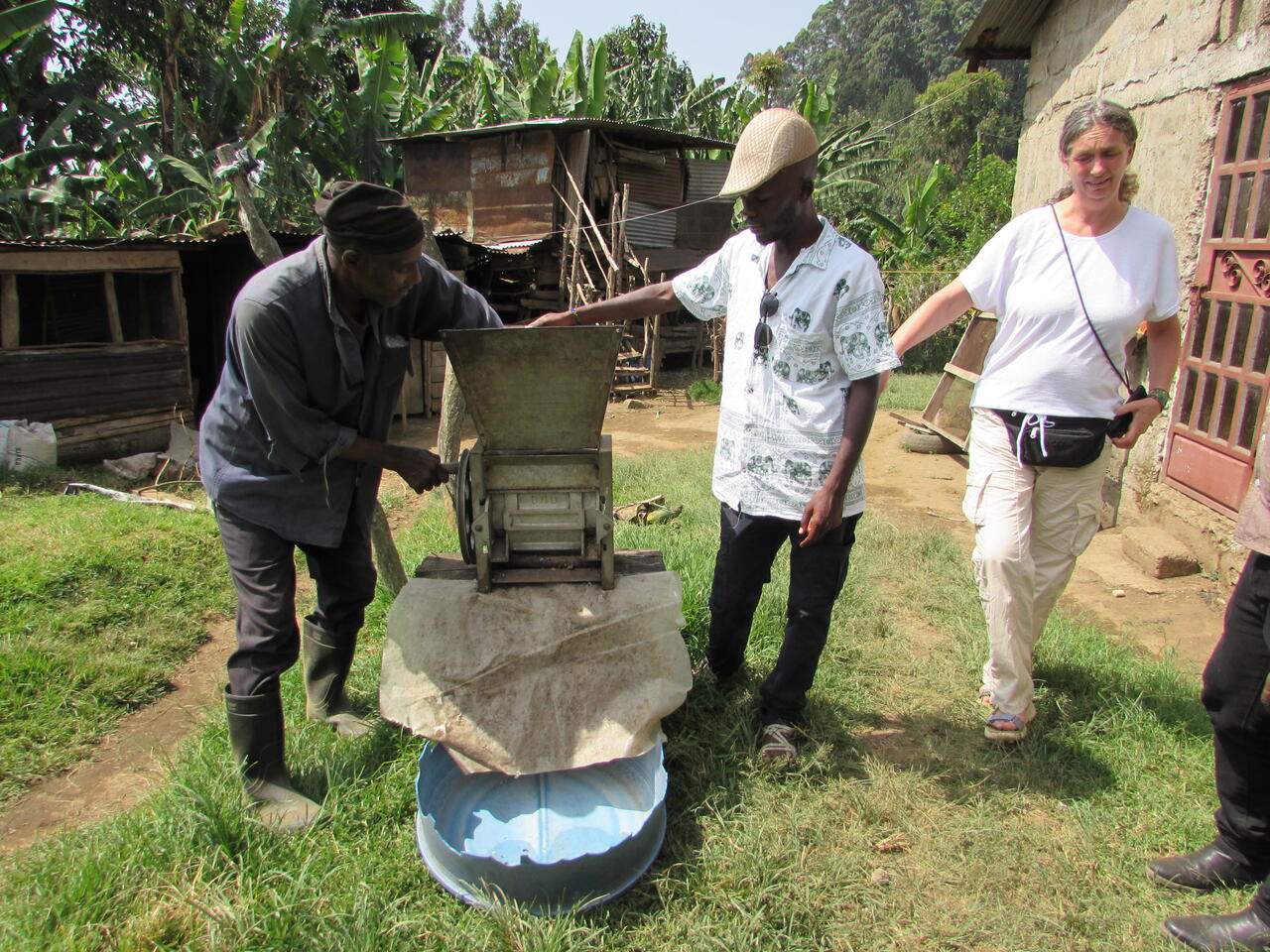 Da der Besitzer kein Englisch spricht, ist der junge Mann als Übersetzer dabei. Hier wird uns gezeigt, wie das Fruchtfleisch der Kaffee Kirsche von der Bohne getrennt wird.