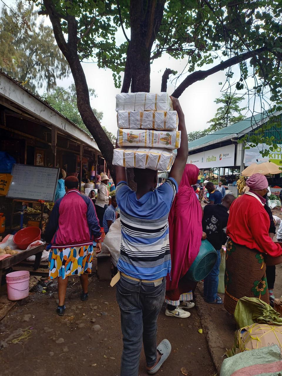 Auf dem Markt halten sich viele junge Männer auf, die sich als Träger ein paar Schillinge verdienen. Er trägt nun unser Porridge zum Fahrzeug.