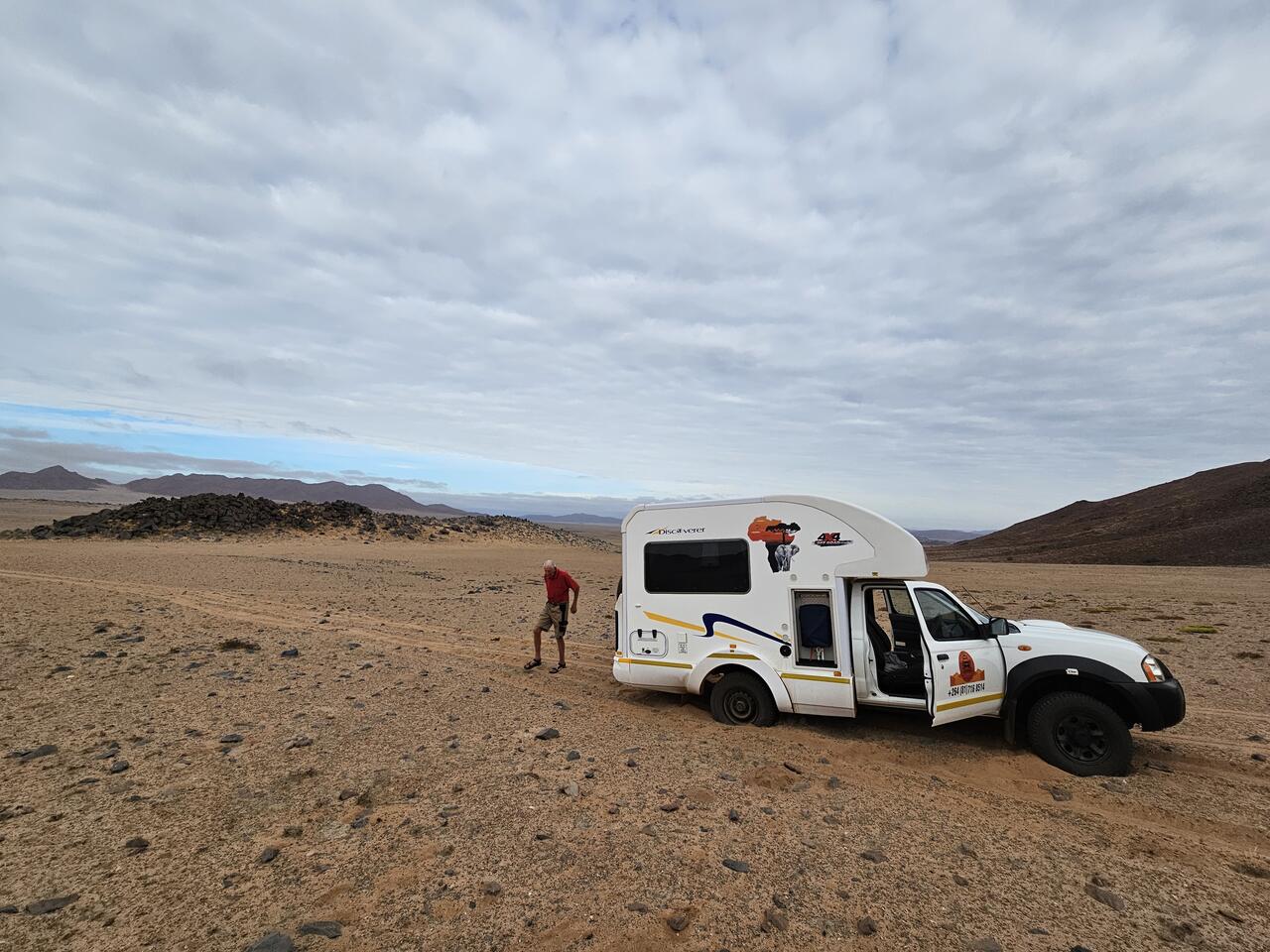 Um die besser befahrbare Straße zu erreichen, müssen wir erst mal 78 km zurück mit Tempo 30 und ständigem Schluckauf, von dort bis zur nächsten Tankstelle wären es bis Henties Bay noch weitere 72 km.