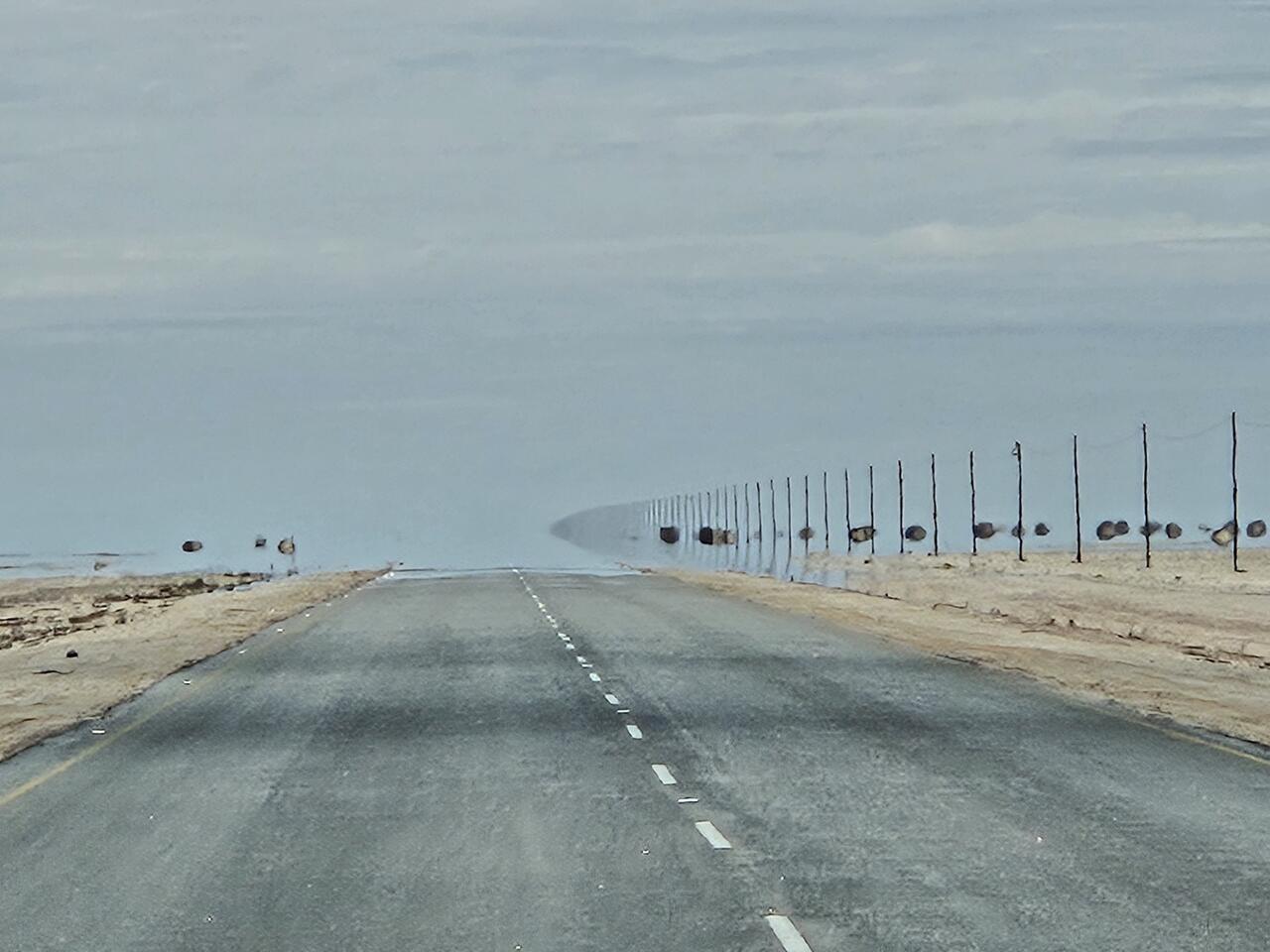 Rechts ein Zeichen, dass wir uns einem Ort mit Zivilisation nähern, Stromleitung bis zu einer Verbrauchsstelle ! Geradeaus nur Luftspiegelung !