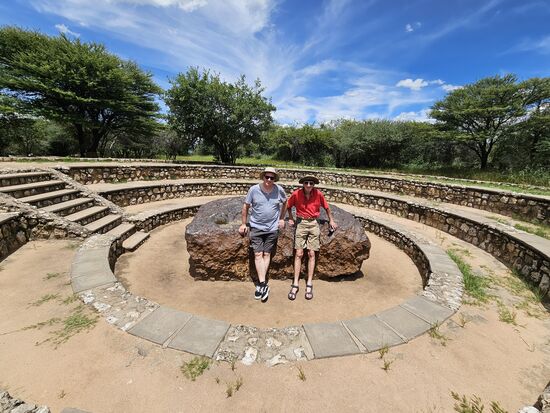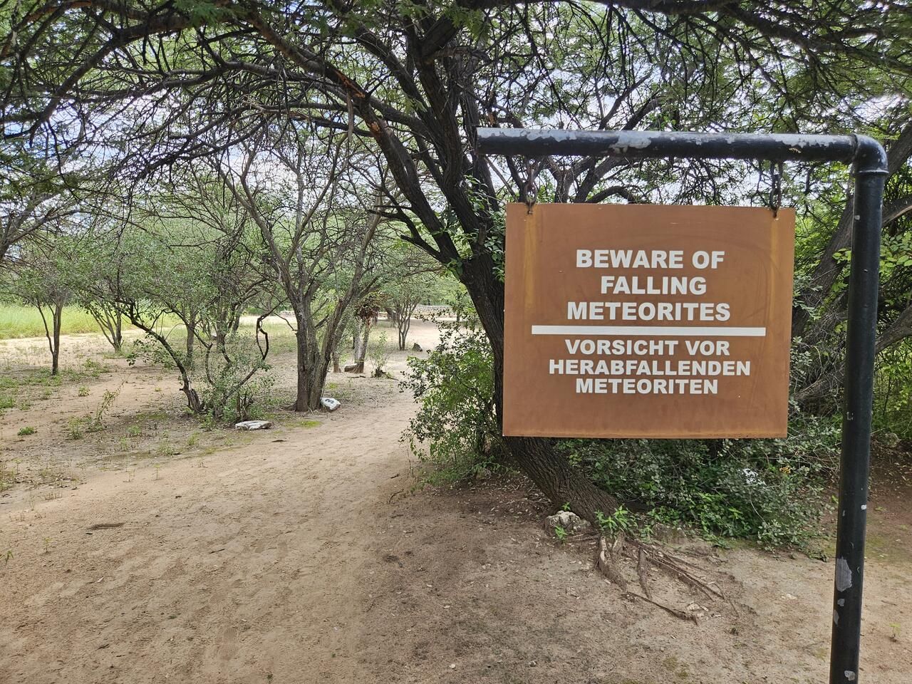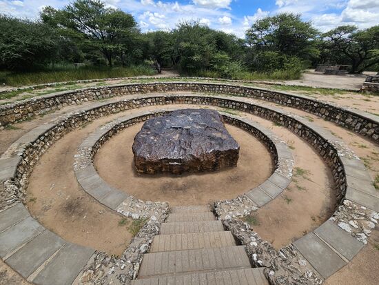 Hier müßte gestern der große Regen heruntergekommen sein, in der Regenzeit hier wohl nichts Besonderes. Rechts und links der Straße alles eingezäunt, dahinter Rinderweiden oder sogar große Maisfelder. Der Name der nächsten Stadt läßt ja auch auf viel Wasser schließen. Wir biegen aber kurz vor Grootfontein rechts ab, um nach erneutem Rechtsabbiegen den Meteoriten zu besichtigen, der hier an der Erdoberfläche zu sehen sein soll.