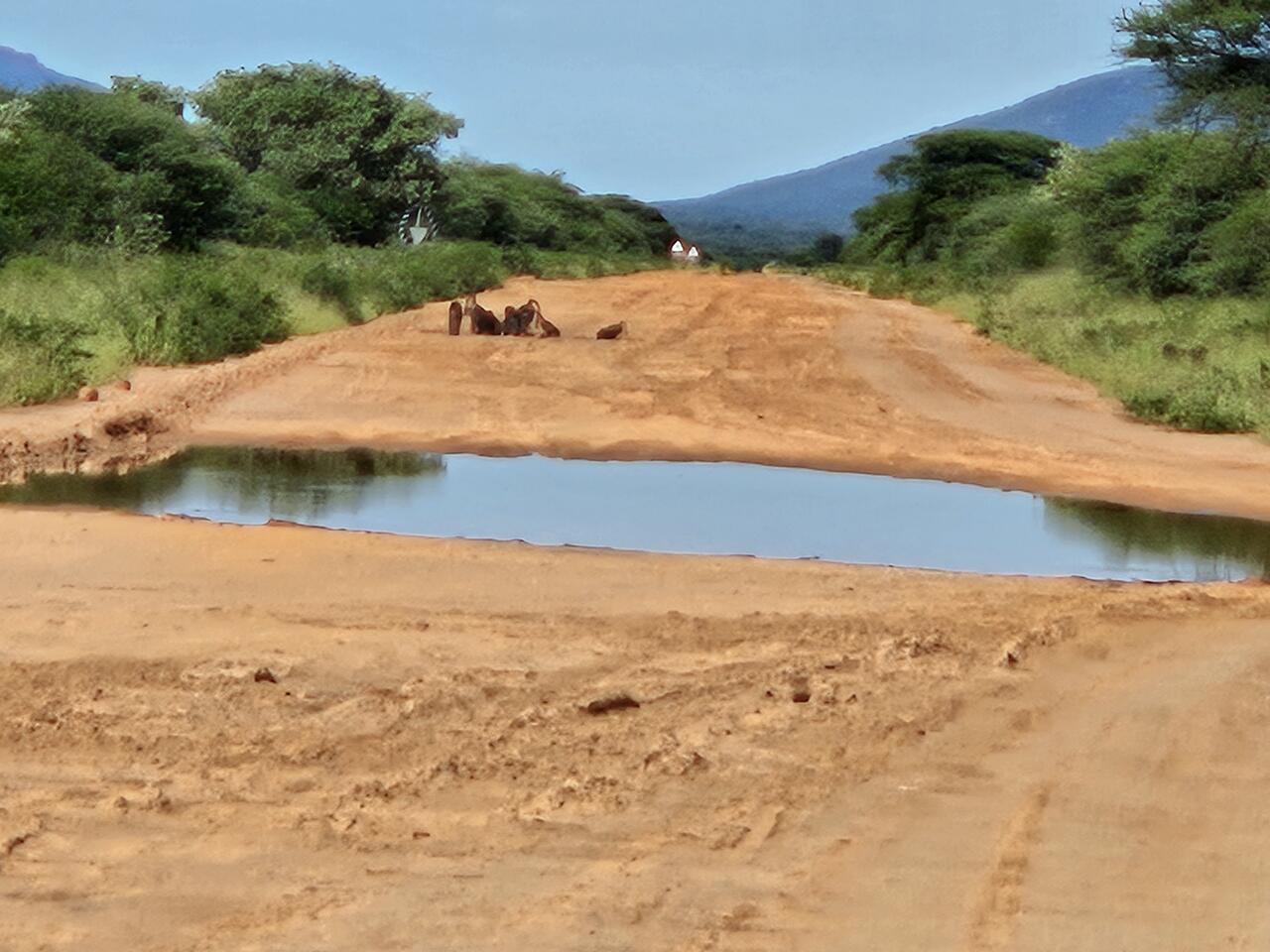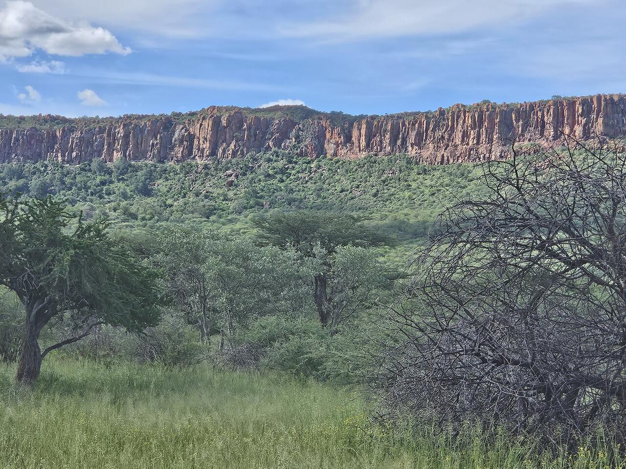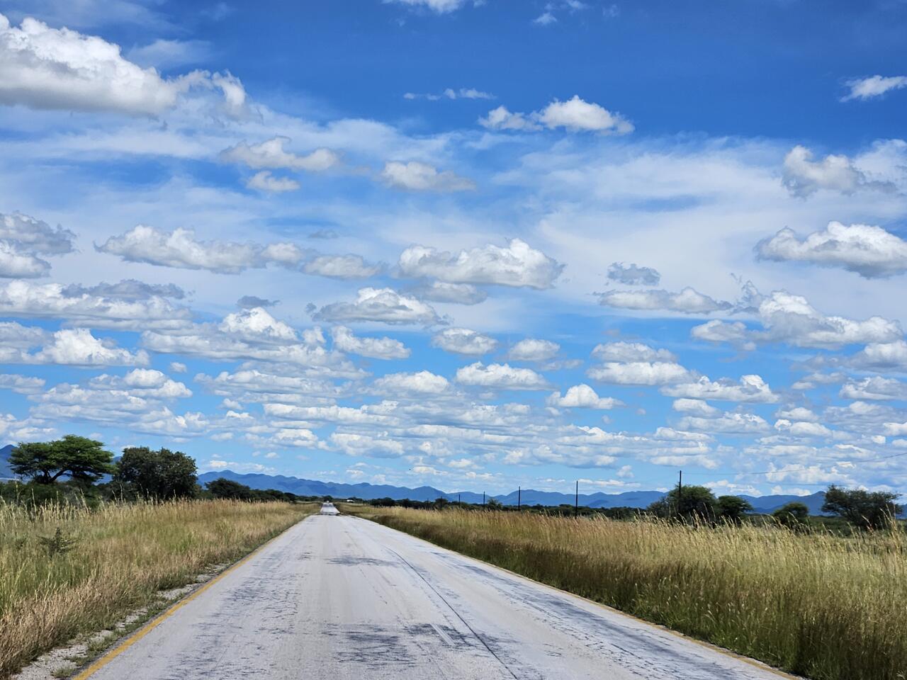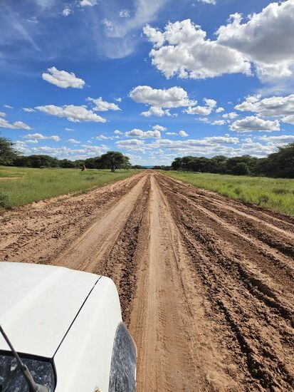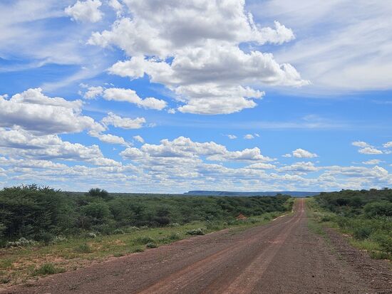 Mit 60 km/h soll man hier angeblich durchkommen, immerhin bis zum Waterberg Campsite etwa 175 km. An Hand der vierstelligen Straßennummer beim Einfahrtsschild wissen wir, dass wir auf dem richtigen Weg sind, hoffentlich stimmt auch die Richtung , da hilft die steil stehende Sonne wenig, allenfalls der Blick voraus auf etwas hohes Flaches, nachdem wir ca. 80 km hinter uns haben.
