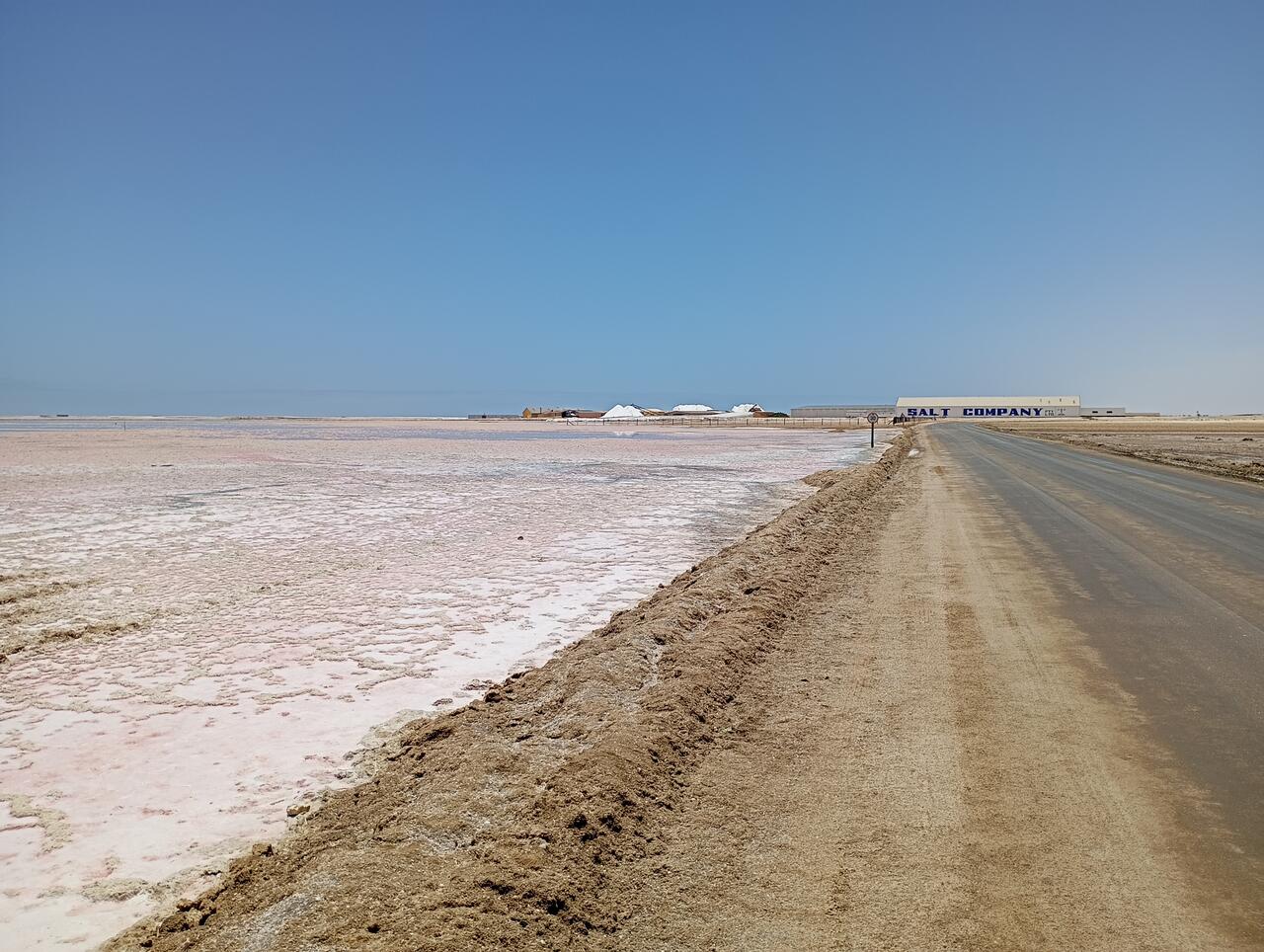 Mile 4, eine Siedlung im äußersten Norden von Swakopmund läßt sich da ansteuern, ich erreiche den Stadtrand mit Blick in die Wüste, der Salt Road Richtung Henties Bay (70 km bis dort !) und am Horizont Richtung Küste sehe ich 3 weiße Pyramiden: SALT COMPANY.
