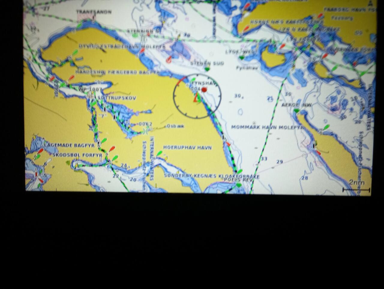 Mit halbem Wind ohne Reff rauschen wir mit über 5 Knoten aus der Flensburger Außenförde nach Südosten, müssen nach dem Leuchtturm etwas anluven, brauchen aber nicht zu reffen. Um auch möglichst nahe an die Schleimündung heranzukommen, müssen wir zeitweise dicht unter Land entlang durch flachere Gewässer. das Echolot solls möglich machen. Zusätzlich krieche ich des öfteren unter Deck, um auf dem GARMIN die optimal noch möglichen Kurse zu erkunden. Die Kurse decken sich mit den Meldungen des Echolots auch bei deutlicher Schräglage.