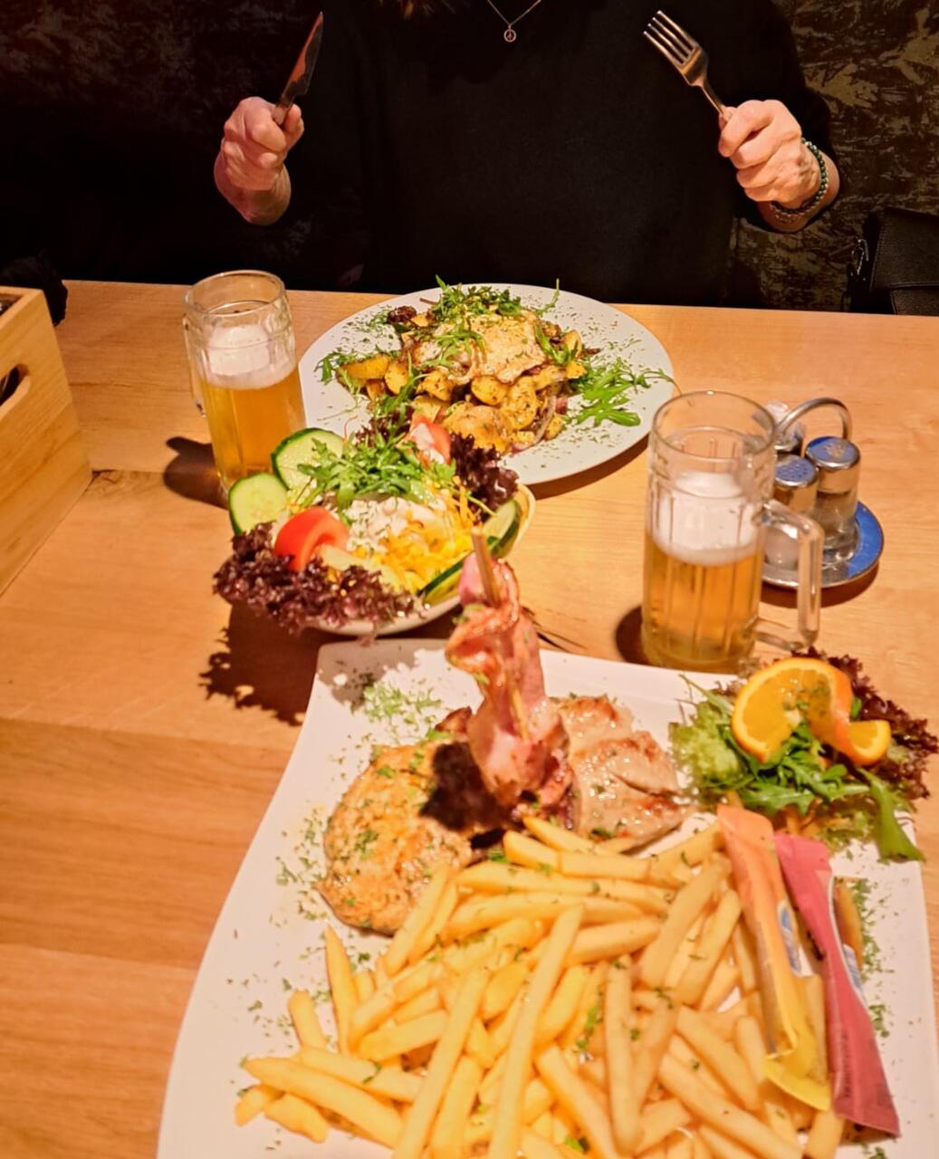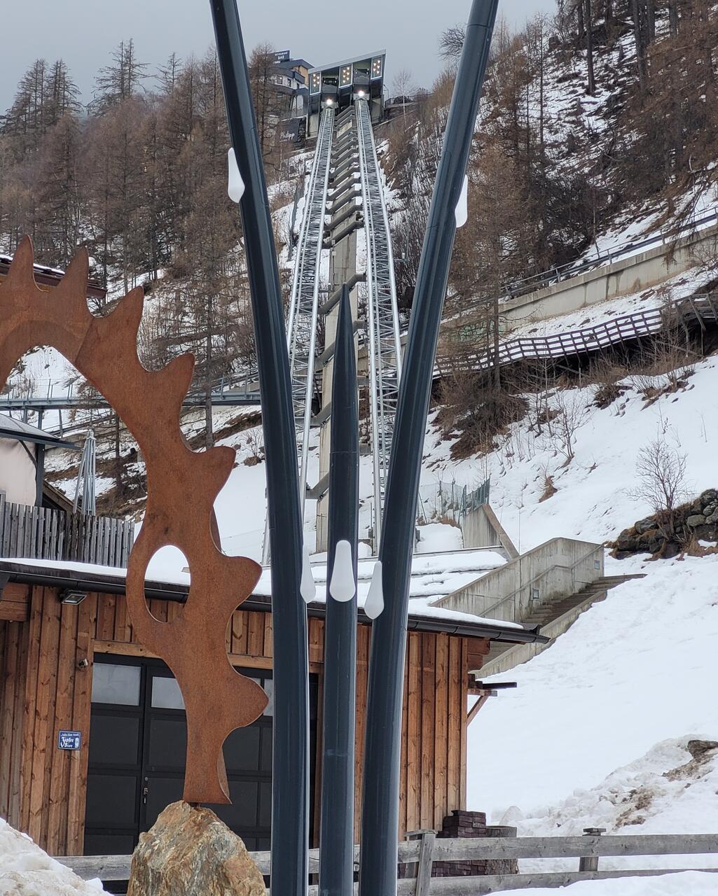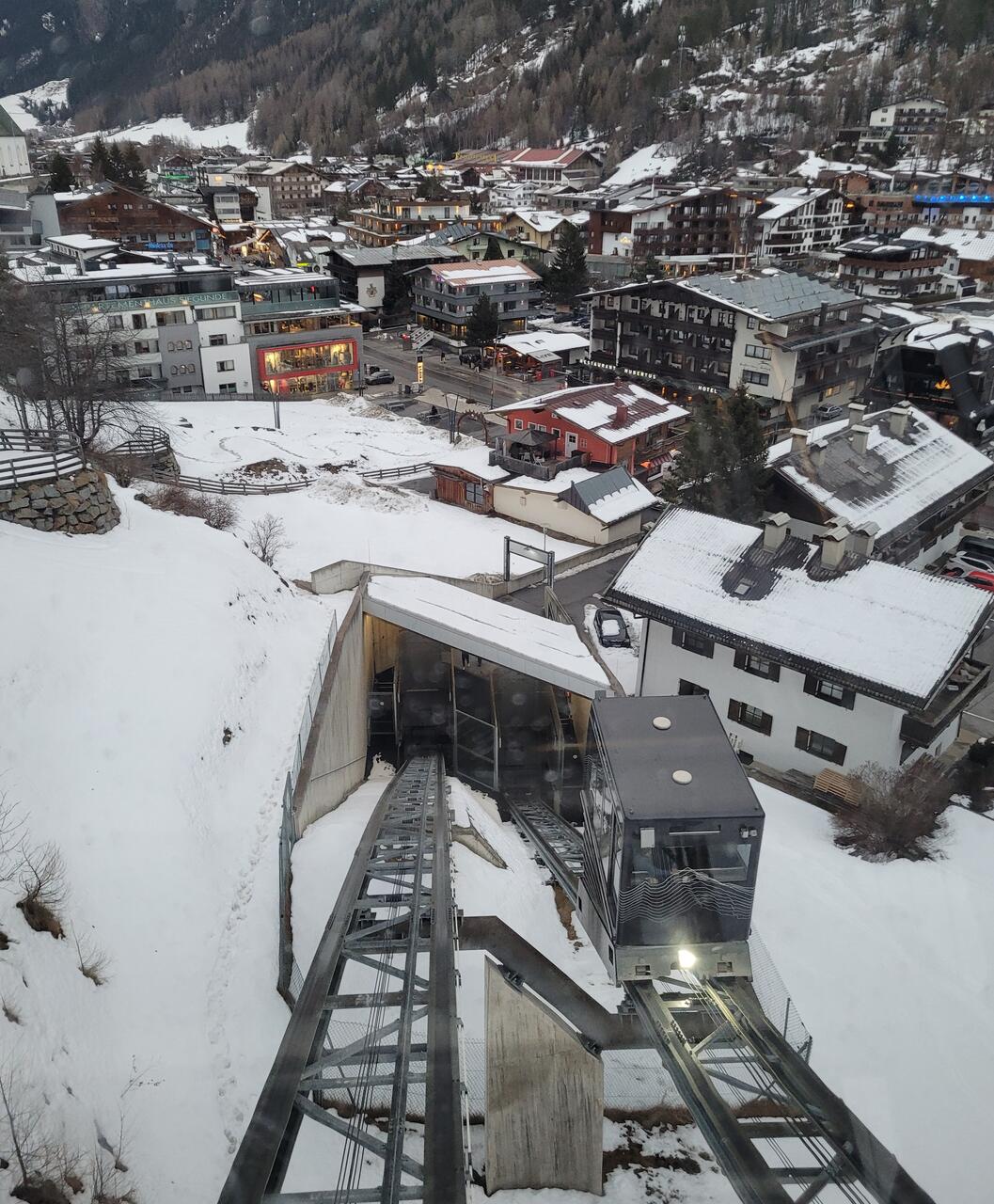 Zum Abendessen gings wieder in die Höhe, aber diesesmal ohne Anstrengung. Der Zentrums-Shuttle, ein doppelter Schrägaufzug, verbindet das Zentrum mit dem höher gelegenen Ortsteil Innerwald. Dort direkt an der Skipiste ist auch so ein Platz, wo die Brettln abgeschnallt und ApresSki-Partys gefeiert werden.