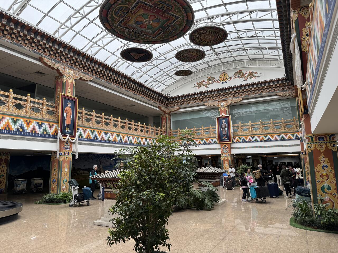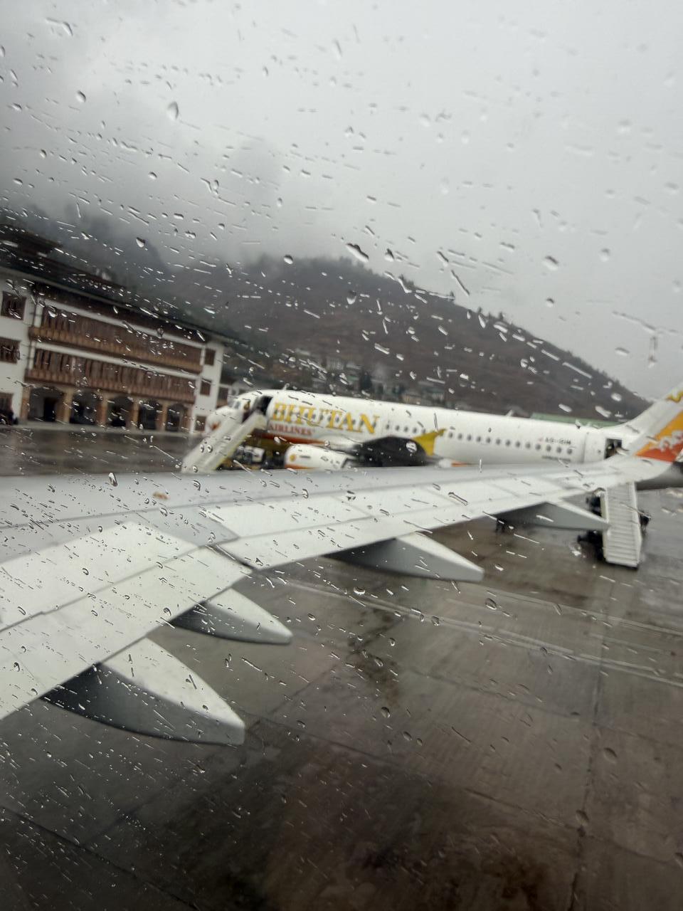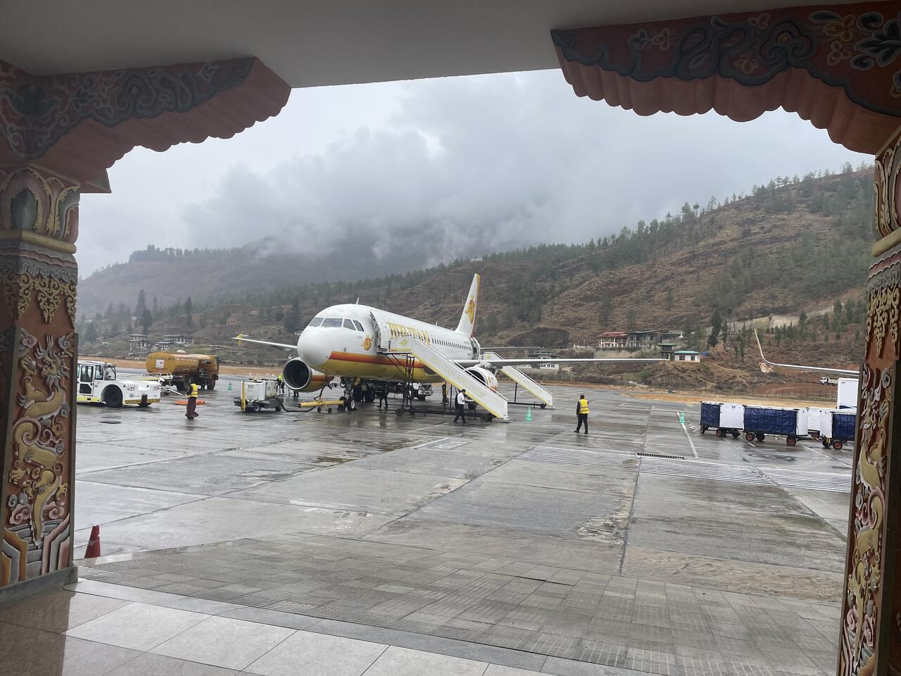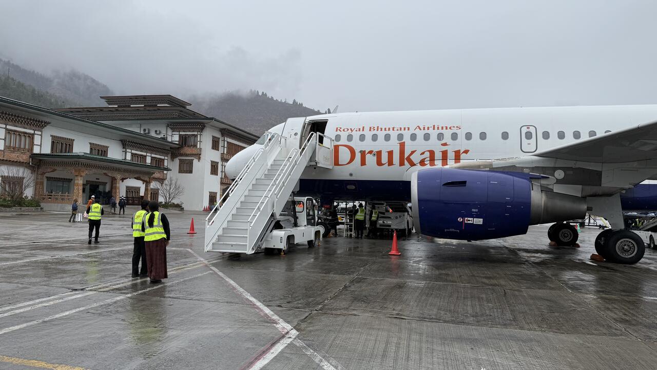 Es gibt in Bhutan nur diesen einen internationalen Flughafen. Er gilt als einer der anspruchsvollsten und gefährlichsten Flughäfen der Welt und liegt auf einer Höhe von 2235m in einem engen Tal umgeben von 5500 m hohen Gipfeln umgeben.