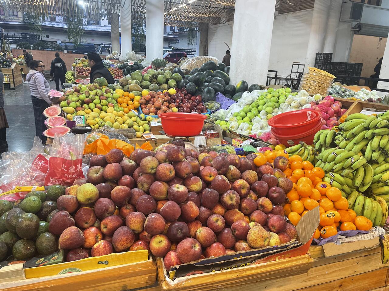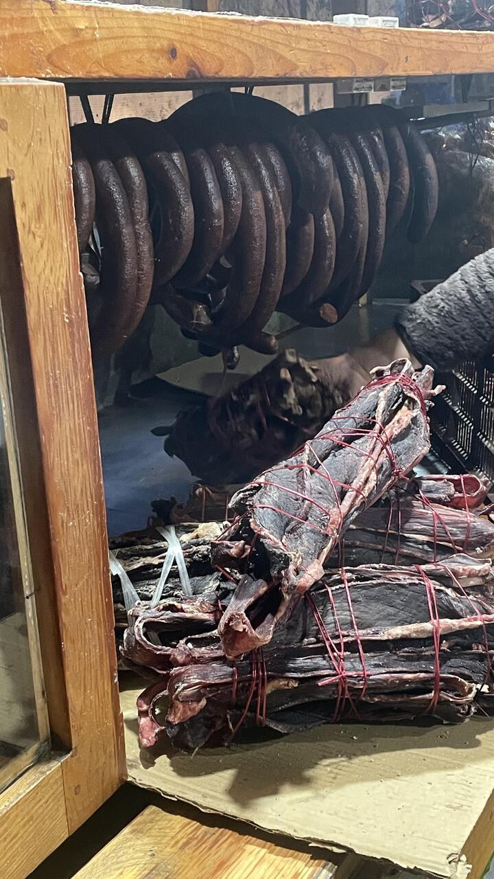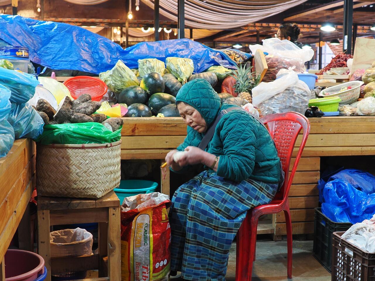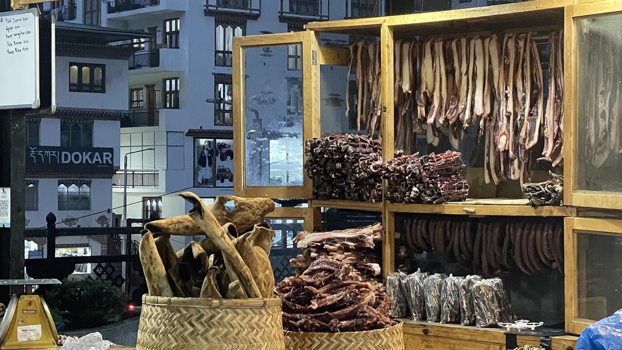 Die große Markthalle ist Zweigeschossig: unten befinden sich die Produkte aus Indien und oben die aus dem eigenen Land - hier wieder die Ketten mit dem getrockneten Käse aus Kuh- und Yak-Milch