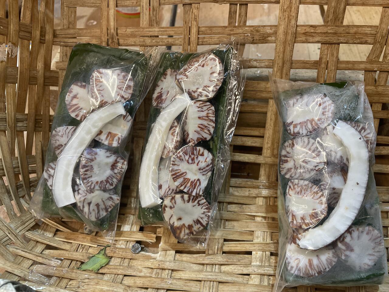 Som zeigt uns wie die Blätter mit einer klebrigen M;Asse bestrichen werden, dann die Nuss drauf und kauen…so ähnlich kennen wir das von Papua!