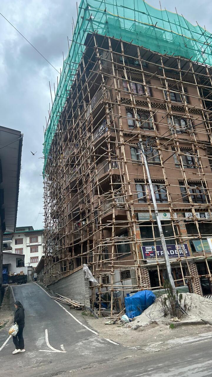 Wir erreichen die Hauptstadt Thimpu - ein großes Haus ist mit Bambus eingerüstet.