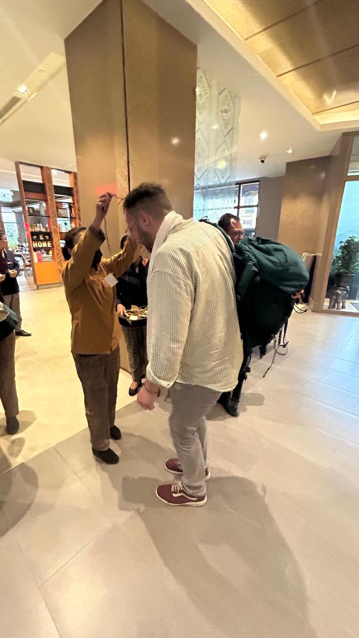 Draußen empfängt uns Regen und unser Guide mit einem Seidenschal als traditionelle Begrüßung und einem Bus, in dem wir gut Platz haben