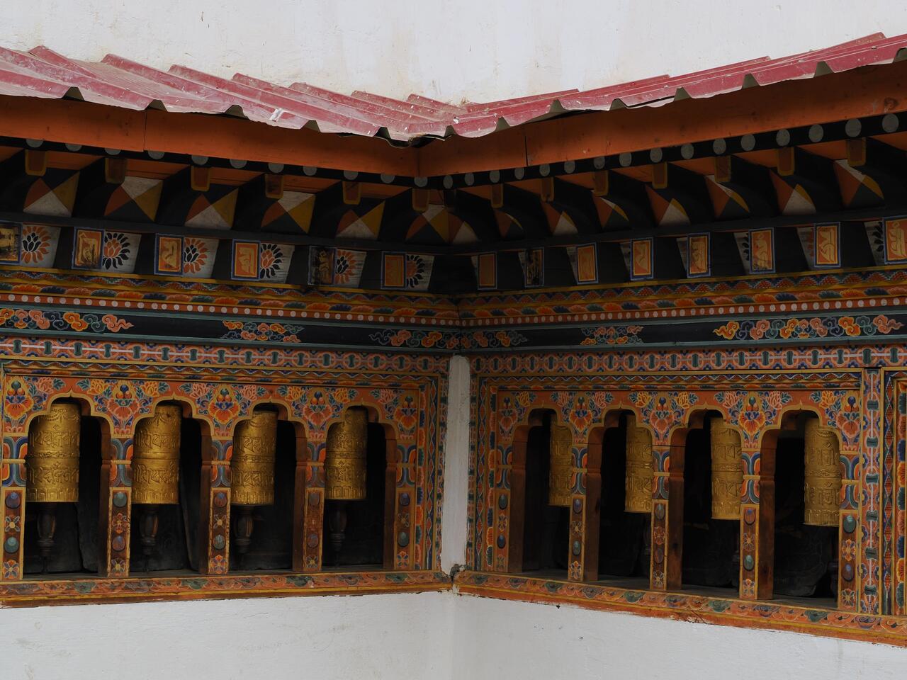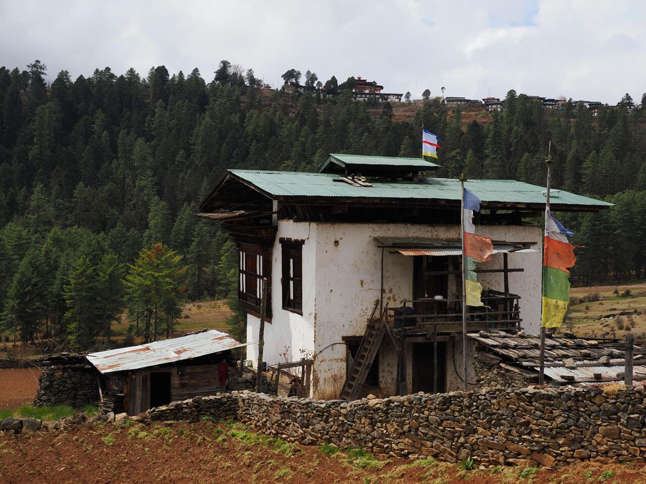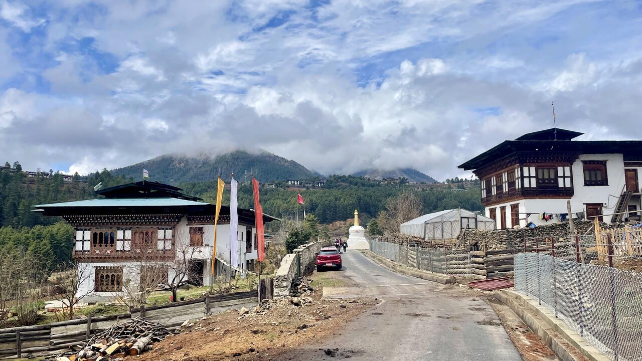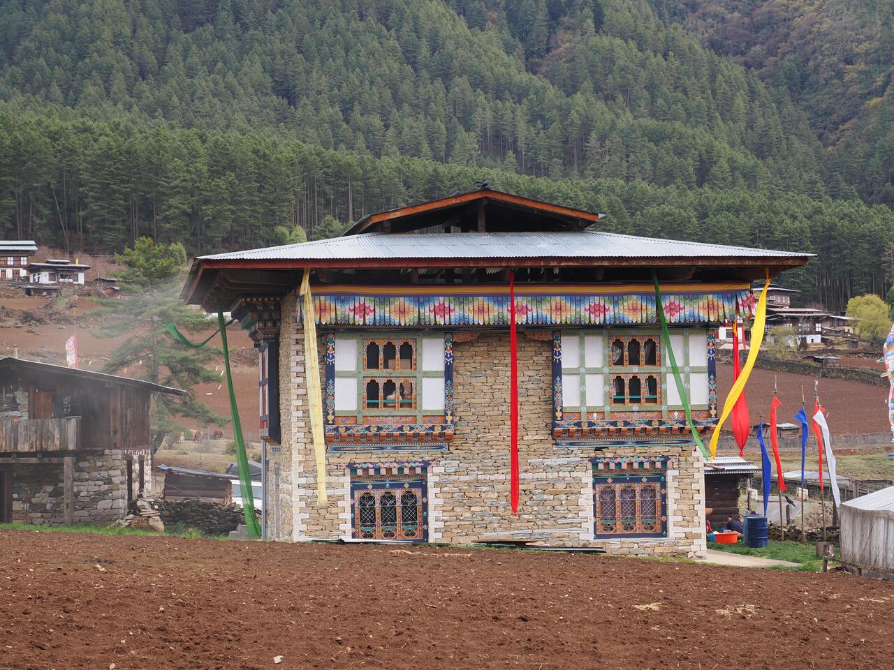 Die Häuser hier zeigen den traditionellen bhutanischen Baustil mit aufwändig verzierten Holzfensterrahmen und flachen Dächern