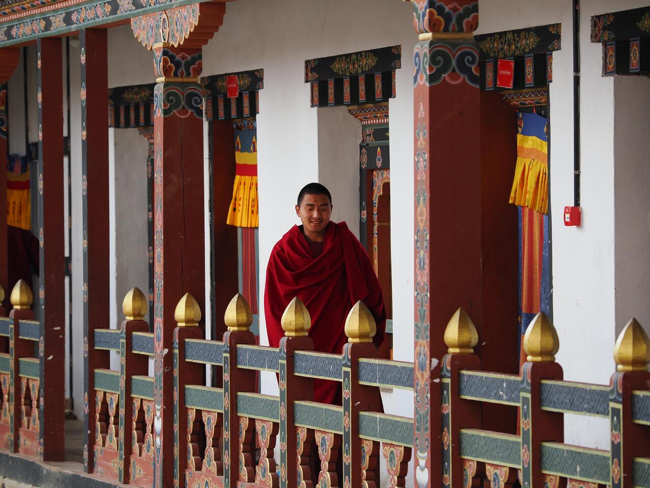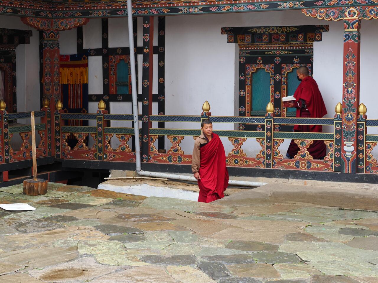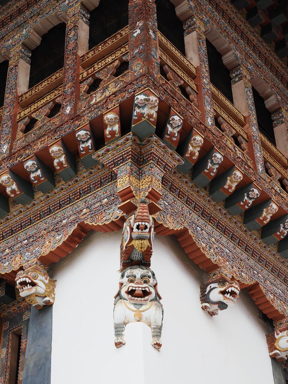 Die Häuser hier zeigen den traditionellen bhutanischen Baustil mit aufwändig verzierten Holzfensterrahmen und flachen Dächern