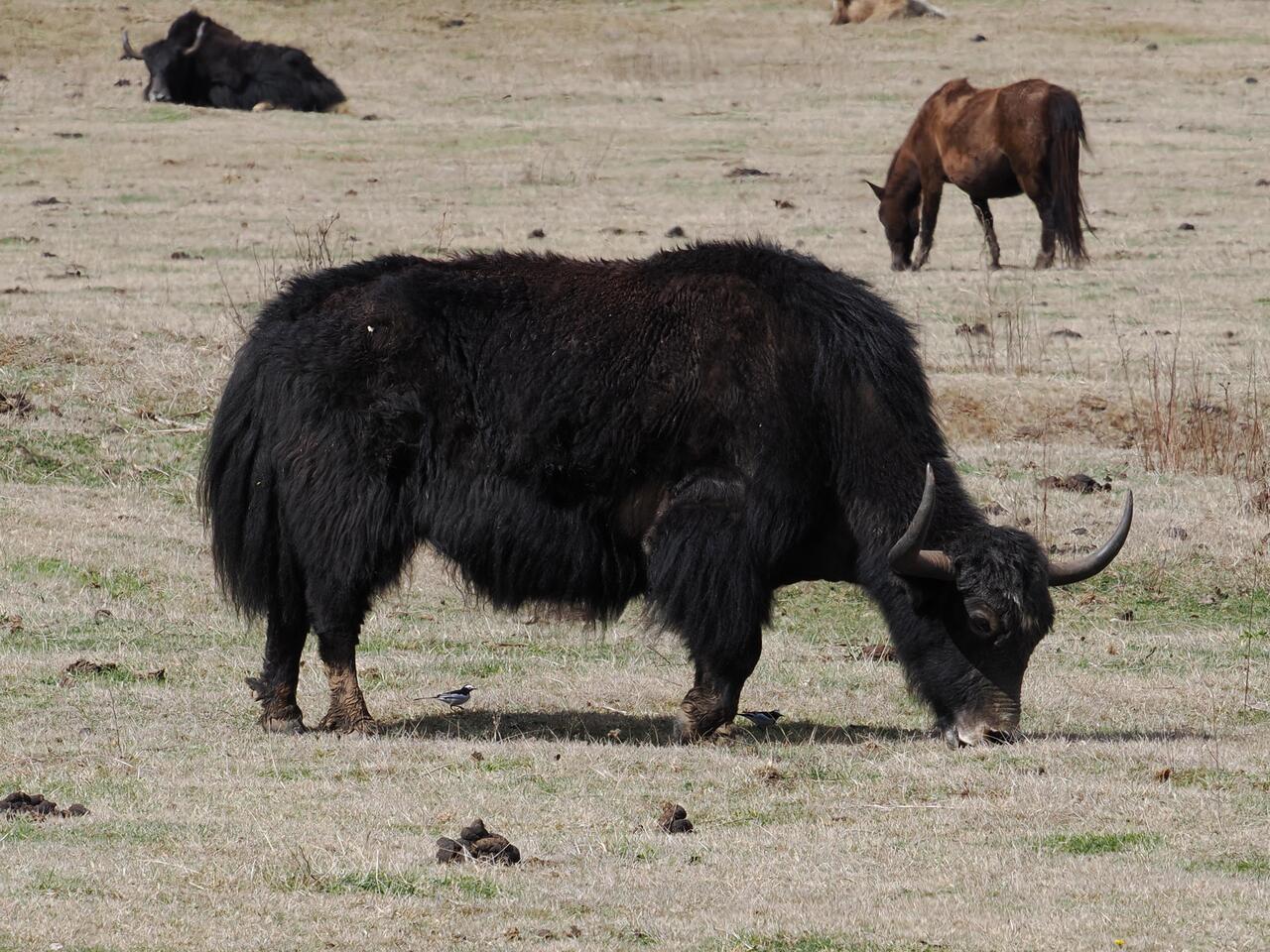 Die Yaks besitzen ein dickes mehrschichtiges Fell, das sie vor extremer Kälte schützt und trittsichere Hufe