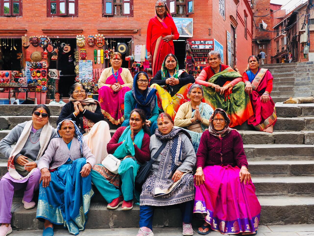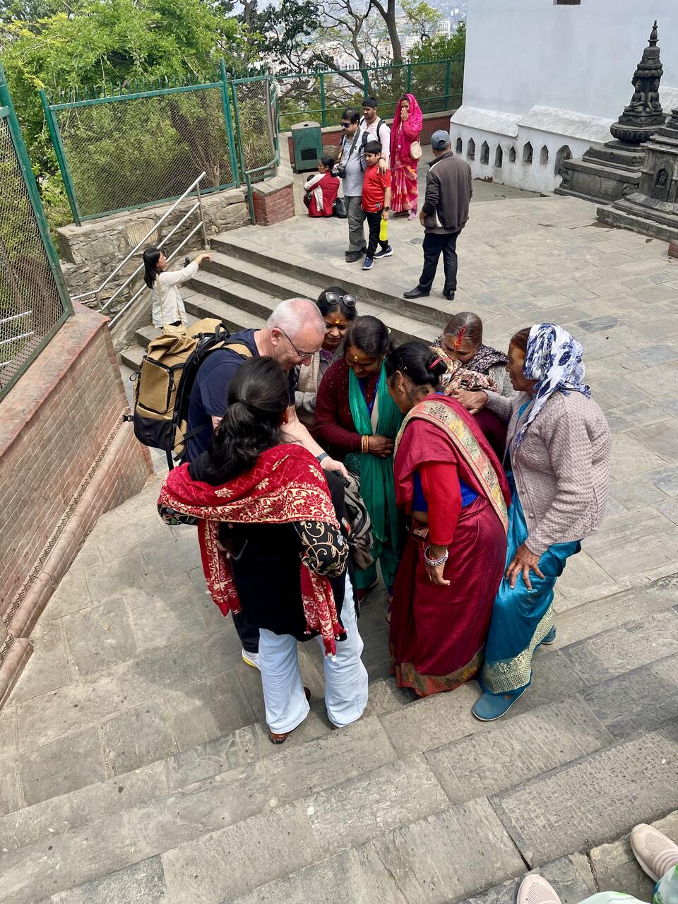Die Anlage befindet sich auf einem Hügel und wir gehen die Treppen hinauf—Thomas macht hier Aufnahmen von einer Gruppe Frauen die bunt gekleidet sind
