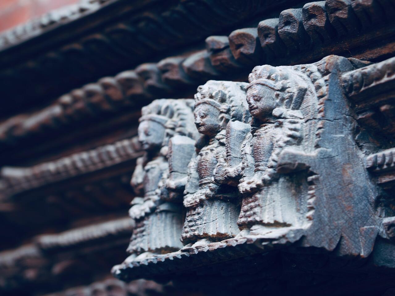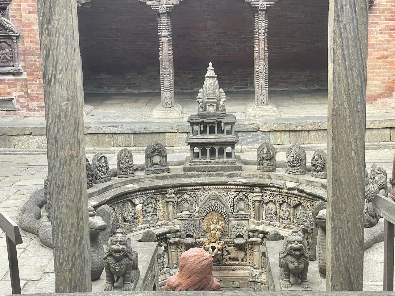 Das Steinbecken ist kunstvoll gestaltet mit 72 fein geschnitzten Steinreliefs von tantrischen Gottheiten und wird von Steinschlangen gesäumt