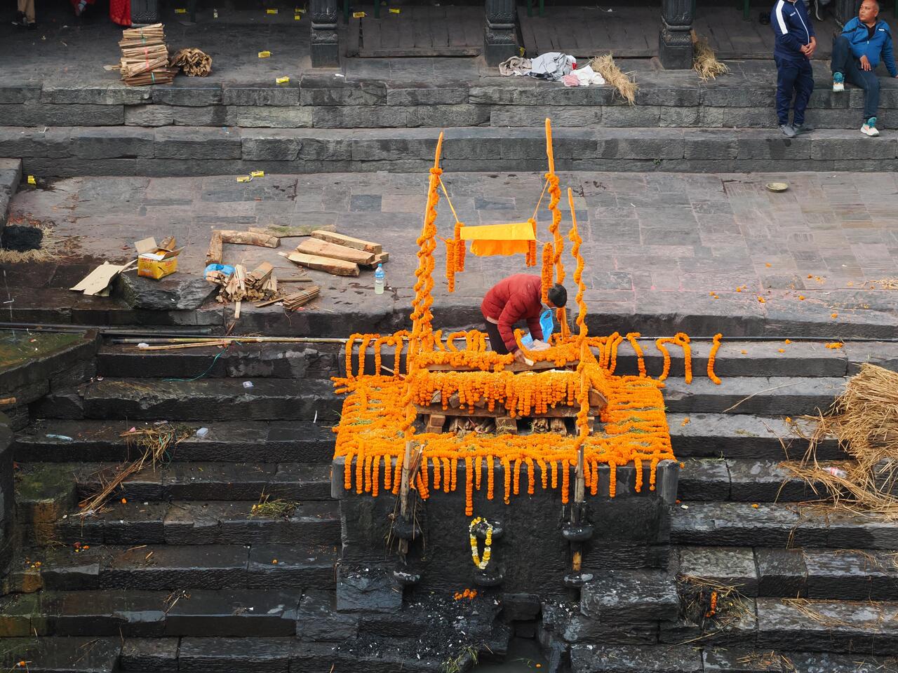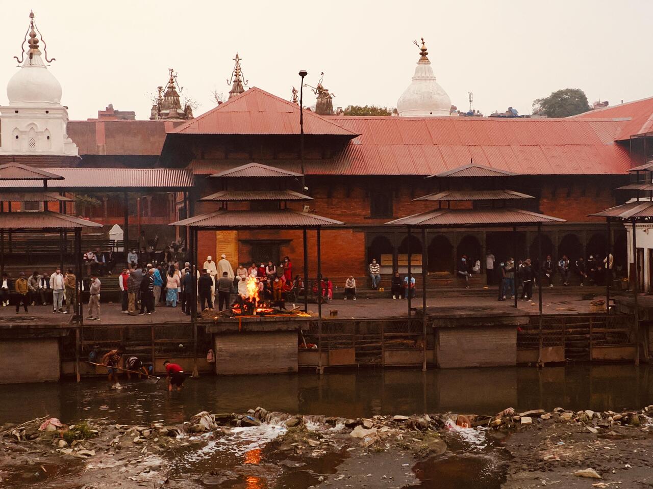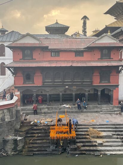 2. Reinigung: Vor der Verbrennung wird der Körper mit dem Wasser des Bagmati gewaschen oder 3x in den Fluß getaucht