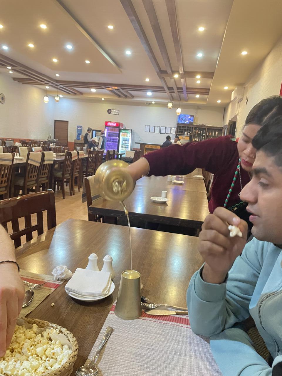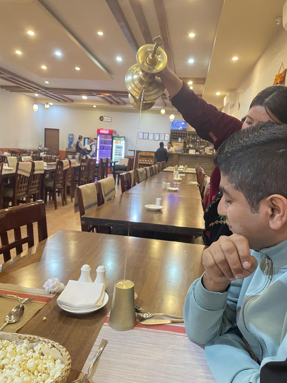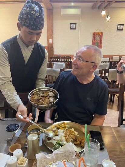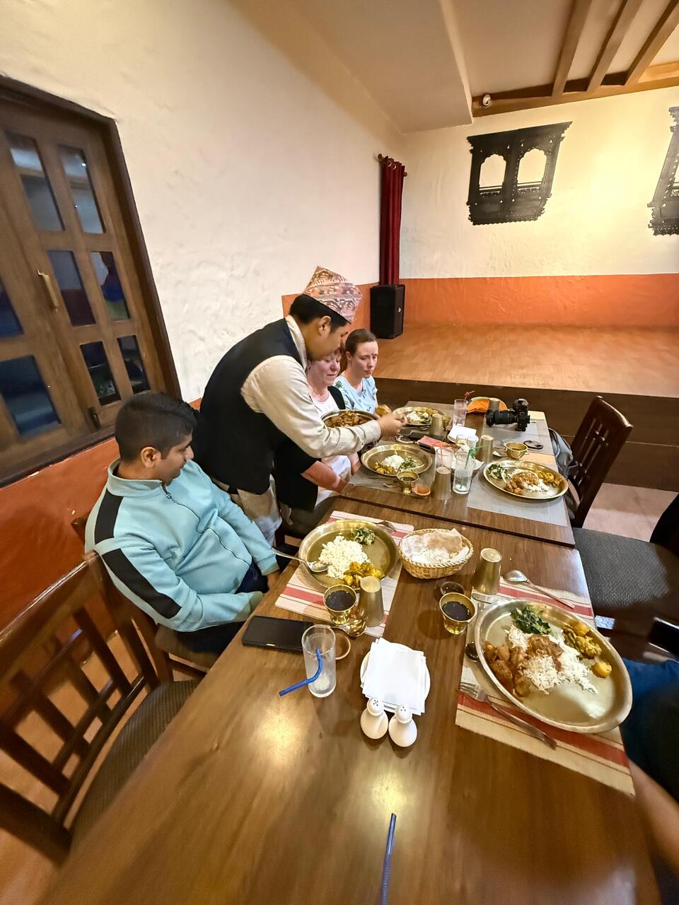Das Ganze findet in einem großen Saal statt und ist eigentlich der Abschluss nach einer Trekkingtour—da aber Thalia und Nicolas wohl erst spät zurückkommen von ihrer Tour, hat er es für uns 4 für heute organisiert.