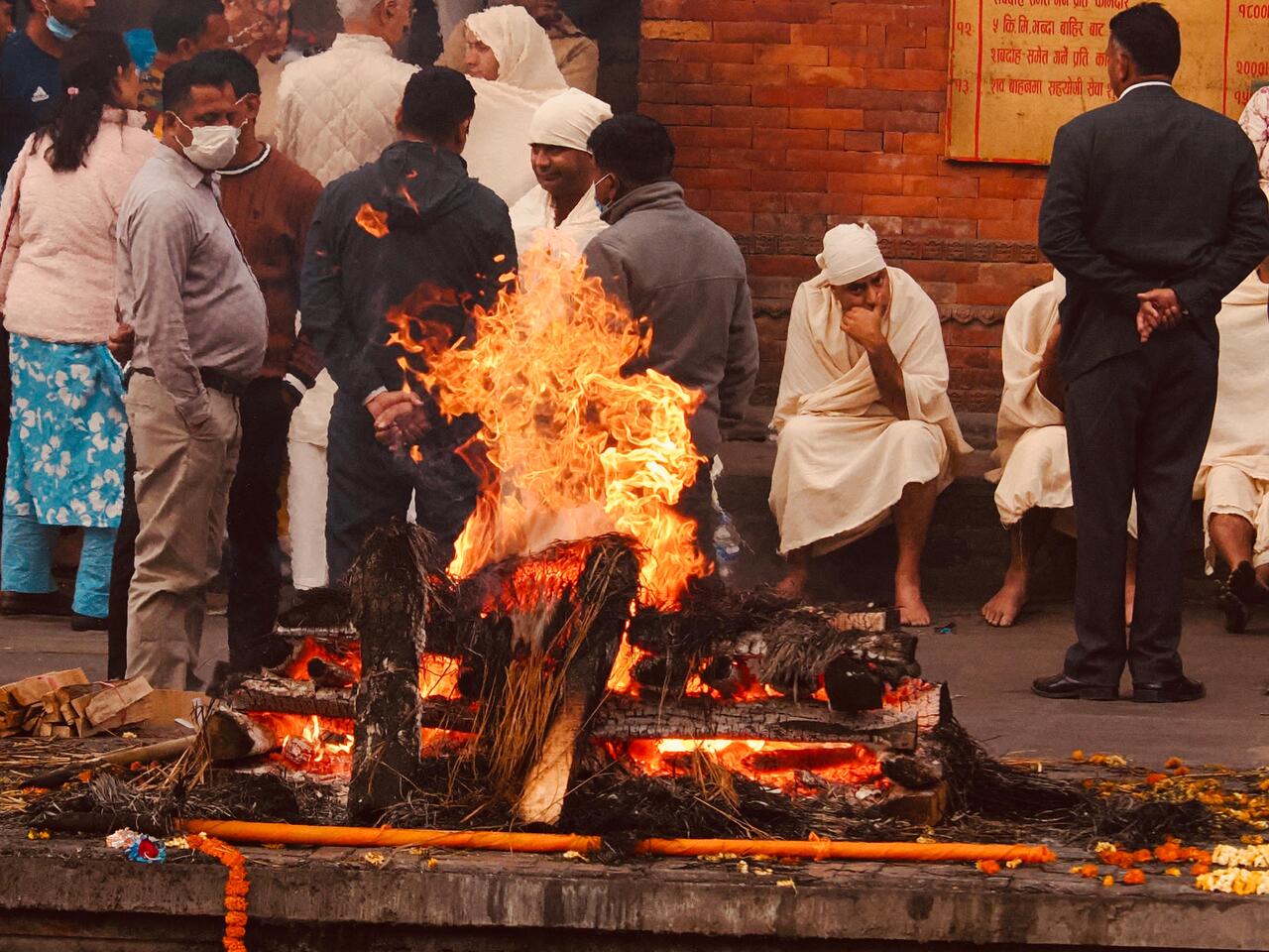 3.: Der letzte Abschied: die Zeremonie wird vom ältesten Sohn geleitet, der den Scheiterhaufen anzündet.
