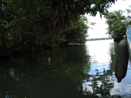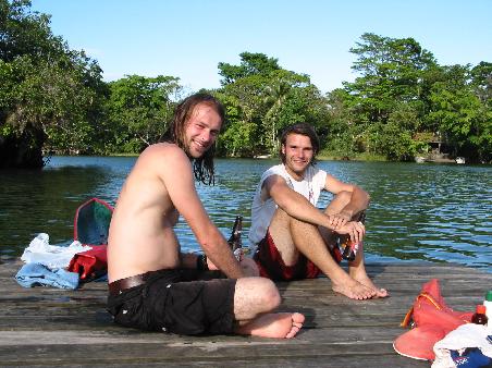 Trotzdem ist mein Hotel mal wieder allererste Sahne! Es ist nur mit dem Boot zugaenglich und liegt in einem Seitenarm des Rio Dulce, in den nur ganz selten der Krach von Motorbooten und Jetskies, diesen Wasser-motorraedern...oder so, dringt. Ich koennte -und ich habe!- hier den ganzen Tag nur rumhaengen und nichts tun, obwohl es einige interessante Dinge zu erkunden gibt. Das Interessanteste war aber bisher immernoch, mit Steffen und Cora per Kanu raus auf das Badefloss zu paddeln, bewaffnet mit Badehose und genuegend Biervorrat...