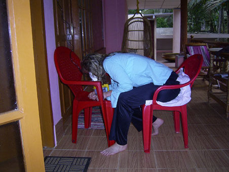 Aha. Ich darf mich ausruhen. Diese Nacht wird hart. Ich bekomme Fieber. Am frühen Abend gehts los, es steigert sich stündlich. Essen kann ich nichts. Alex macht die ganze Nacht hervorragenden Krankenpflegerdienst. Kalte Wadenwickel, kalte Wickel nach und nach über den ganzen Körper verteilt- im 30 min-Takt. Er schafft es tatsächlich. Mein Körper kühlt sich allmählich ab. Verschiedenste Veranstaltungen unterhalten uns bis in die frühen Morgenstunden. Es geht mir sehr schlecht. Psychisch so schlimm wie physisch. Sofort will ich den Moloch von Indien hinter mir lassen. Raus aus diesem brachialen Land, weg von all dem Lärm! Zusammenfassend ist zu sagen, das seit dieser Nacht nichts mehr so war, wie am Anfang. Es folgten keine Massagen mehr, nicht eine einzige Anwendung konnte ich an mich heranlassen.