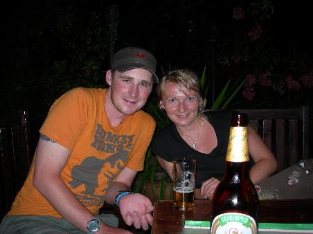 im minibus lernetn wir ashley (aus australien) und dave (aus irland) kennen, mit denen wir auch in einem hotel wohnen. die stadt ist so winzig, dass man sich taeglich mehrmals ueber den weg laeuft. wir haben uns auf ein paar loabeers in eine bar gesetzt und dem treiben zugesehen. man sollte sich allerdings immer in acht nehmen. wenn man sich etwas zu essen oder trinken bestellt, das den namen "happy" traegt (z.b. happy pizza oder happy fruit shake), sollte man die finger davon lassen, denn hier sind unmengen marihuana im spiel, die einen leicht ausknocken koennen. auf drogenkonsum und -verbrauch steht die todesstrafe in laos. wir gaben also acht und hielten uns eher im bierbereich auf.