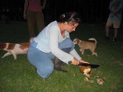 Zum Abschied und zum WM-Auftaktspiel Costa Rica - Deutschland organisierten wir eine kleine Feier auf der Finca. Die Auslaender (Ingeltera, Alemania) kochten, Julio sorgte fuer Strom, Fermin stellte seinen neuen grossen Fernseher zur Verfuegung und Deutschland schoss die Tore!