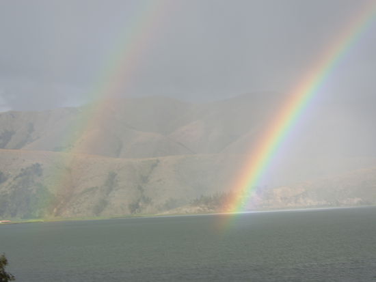 Am spaeten Nachmittag gings dann noch nach Jauja, eine Autostunde noerdlich von Huancayo. Und von dort weiter zur Laguna de Paca. Blauschimmerndes Wasser, Schilf am Ufer und ein schoener Blick auf die Berge im Hintergrund. Hier liess es sich aushalten! Ausserdem gab es ueber der Lagune gegen spaeter den wohl klarsten Regenbogen zu sehen, den ich bisher gesehen habe. Und nachdem es auch noch anfing zu regnen, gesellte sich sogar ein zweiter dazu!