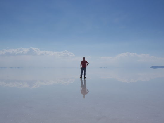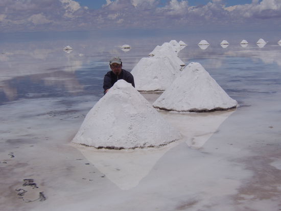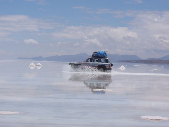 Am ersten Tag wurde der riesige Salzsee in der Naehe Uyunis besichtigt. 12000 Quadratkilometer, die wohl in der Trockenzeit in einem einzigen Weiss vor einem liegen. In der Regenzeit ist die durchschnittlich 12 m dicke Salzschicht, unter der sich ein richtiger See befindet, bedeckt mit bis zu einem halben Meter Wasser, durch das unser Jeep dahinsauste. Selbst in der Regenzeit ganz impressionant weit und breit nur weiss und einiges blau schimmernde Wasser zu entdecken. Auserdem stand noch ein Abstecher zur Isla del Pescado, eine Insel in Form eines Fisches inmitten des Salzes, auf dem Programm. Dort gab es eine ganz nette Wanderroute durch Steine und riesige Kakteen.