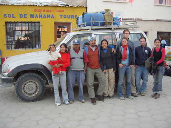 Zwar reichlich verwirrt, aber letztendlich sass ich dann doch zusammen mit einem bolivianisch-amerikanischem und einem neuseelaendischen Paerchen, einer netten Mexikanerin (Andrea), mit der ich mich die naechsten Tage richtig gut anfreundete sowie unserem bolivianischen Fahrer mit Kind und Ehefrau als Koechin.