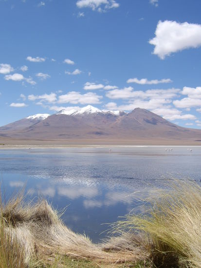 Nach der Uebernachtung in simpelsten Quartieren eines kleinen bolivianischen Dorfes, gings dann abermals fruehmorgens auf in eine Wuestenlandschaft. Trotz Wueste war es verdammt kalt, da es immer weiter in die Hoehe ging. Die 2.Uebernachtung war auf ca.4200 Metern. Im Hintergrund tauchten immer mal wieder schneebedeckte Berge auf.