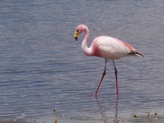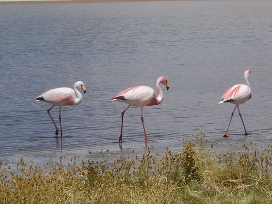 Nicht weit entfernt kamen wir beim naechsten See an. Nicht ganz so blau, da ein Teil des Sees noch eine Salzschicht miteinschloss, dafuer mit noch mehr Flamingos, die man aus naechster Naehe beobachten konnte.