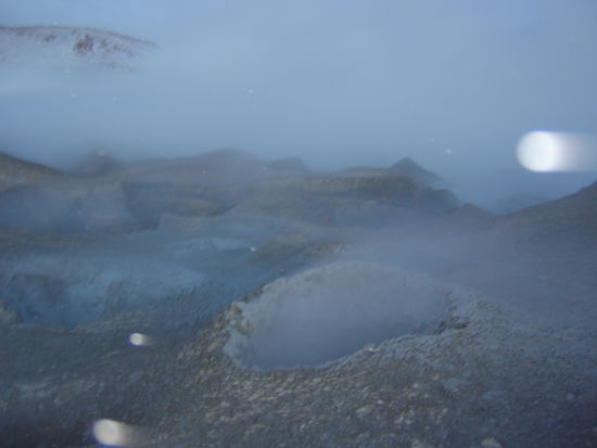 Am letzten Tag dann die haerteste Uebung: Aufstehen um 4 Uhr morgens in kompletter Dunkelheit! Eine Stunde spaeter, als es gerade hell wurde, bekamen wir dann sprudelnde und rauchende Geysire zu sehen. Allerdings erlebte ich an diesem Morgen den Winter, den ich dieses Jahr in Deutschland verpasse. Laut Fuehrer geschaetzte -5 bis -8 Grad. Und das ganze ohne jede warme Jacke! Ringsum lag uebrigens auch schon kraeftig Schnee. Wir waren auf 4870 Metern angekommen.