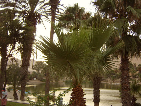 Umso schoener anschliessend die Ankunft an der Oase 4 km ausserhalb Icas. Hatte ich meine Reise in der "Hoelle Perus" Lima begonnen, so war ich nun definitiv im Paradies angekommen. Rund um die schoene Lagune sieht man an dem Sandstrand jede Menge Palmen und gruene Pflanzen, in der Mitte der Lagune befindet sich Schilf, in und um dieses verstecken sich einige Wasservoegel, von denen ich nicht alle einzuordnen vermochte.
