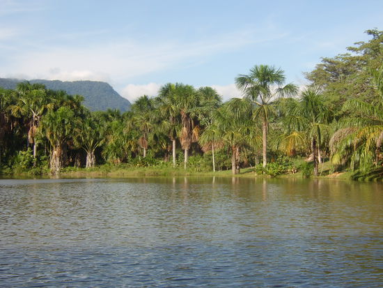 Noch schöner wurde die Landschaft, sobald man sich etwas aus der Stadt entfernte. Am ersten Tag machte ich mittags zu Fuß auf den Weg zur Laguna Venecia, 4 km außerhalb der Stadt. Die kaum erträgliche Hitze machte die Wanderung allerdings nicht angenehmer und so kam ich nach einer knappen Stunde ziemlich durchgeschwitzt an der idyllischen Lagune an. Die Laguna Venecia erinnert schon sehr an die paradiesische Oase Huacachina bei Ica, mit dem Unterschied, dass hier rund um alles grün anstatt Sand ist. Außerdem gab es noch einige Affen aus nächster Nähe zu bewundern, die allerdings traurigerweise an nicht allzu langen Ketten angekettet waren.