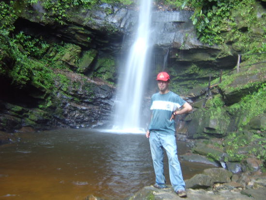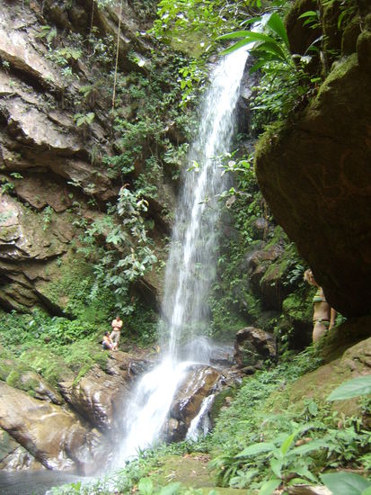 Nach einer knappen Stunde erreichten wir dann Wasserfall und die kleine Lagune, in der man wie am Vortag bei den Cataratas von Ahuashiyacu wunderbar baden konnte. Dieses Mal wagte ich den Sprung (aus 3-4 Metern) ins kühle Nass. Wunderbar erholsam und besser als jedes Schwimmbad. Der Wasserfall war die ideale Wassermassage und "Sprungbretter" in jeder Höhe standen auch zur Verfügung.